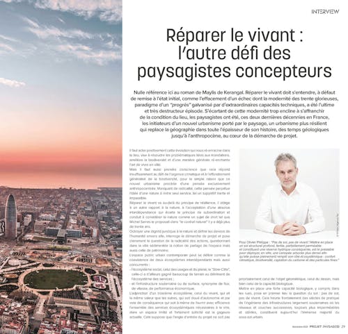 Publiée dans la nouvelle revue PROJET PAYSAGE(S) des éditions de Bionnay et de la Fédération Française du Paysage, la tribune d’Olivier Philippe « Réparer le vivant, l’autre défi des paysagistes concepteurs » s’inscrit dans la prise de conscience actuelle de l’apport des paysagistes concepteurs à la transition écologique.