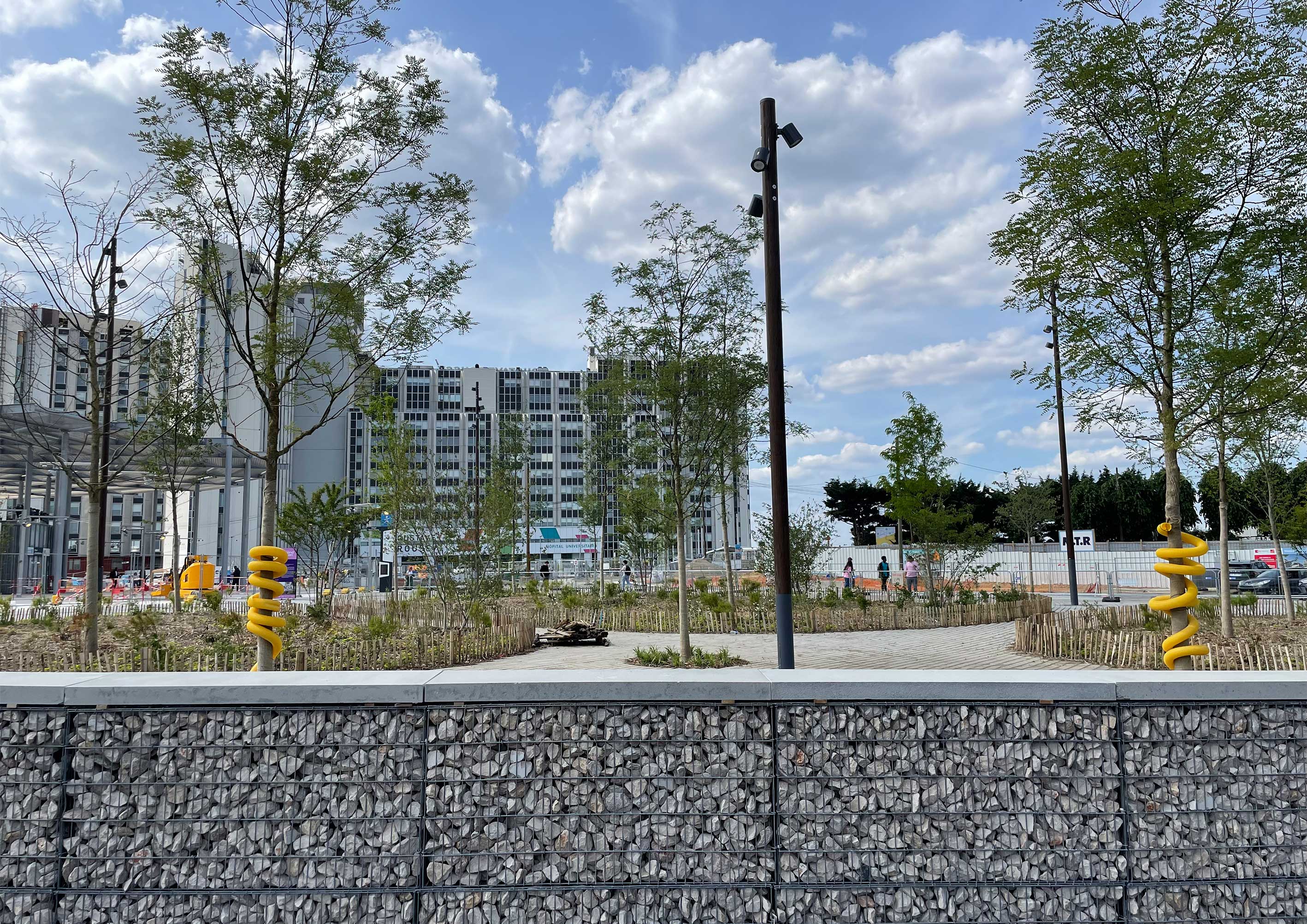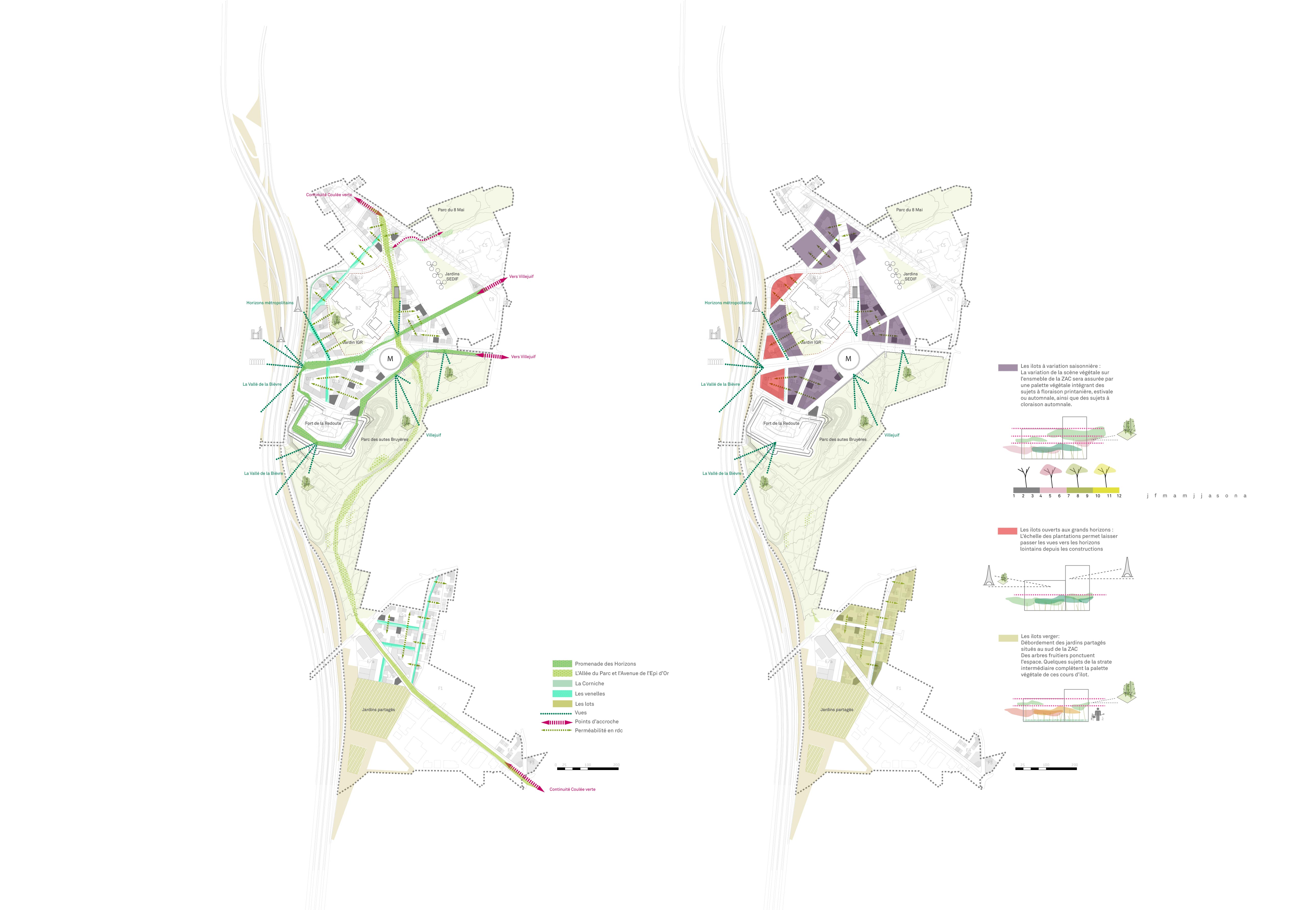 Part of the Campus Grand Parc ZAC is located on a plateau overlooking the Vallée de la Bièvre. A Promenade des Horizons takes advantage of the site's unique plateau topography, providing a viewpoint over immediate horizons, a route along the edge of the plateau and a breathing space. The Allée du Parc leads all the way to the new metro station and hosts the green corridor. Plants are given pride of place, helping to create different atmospheres and limit the heat island effect.
