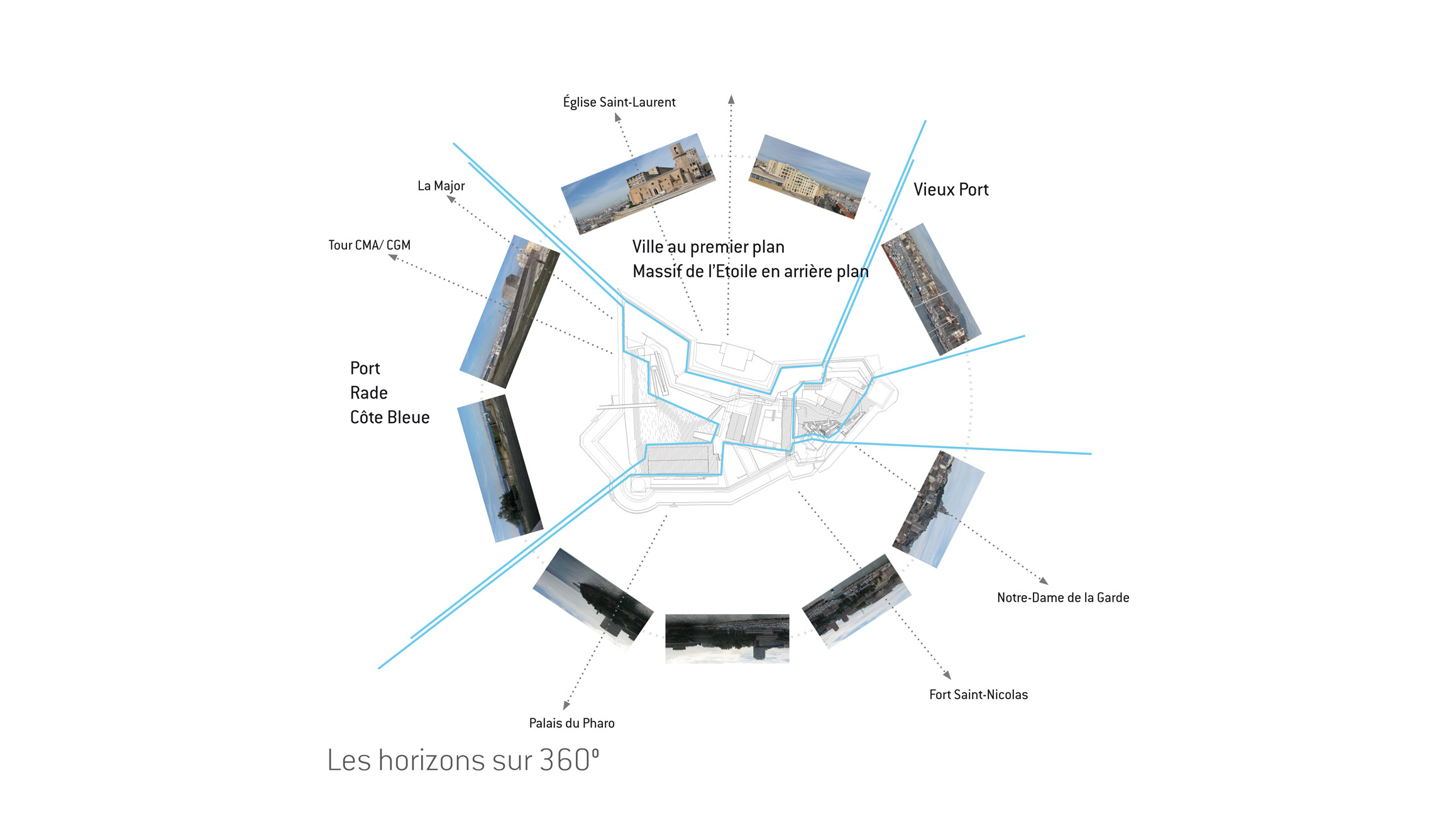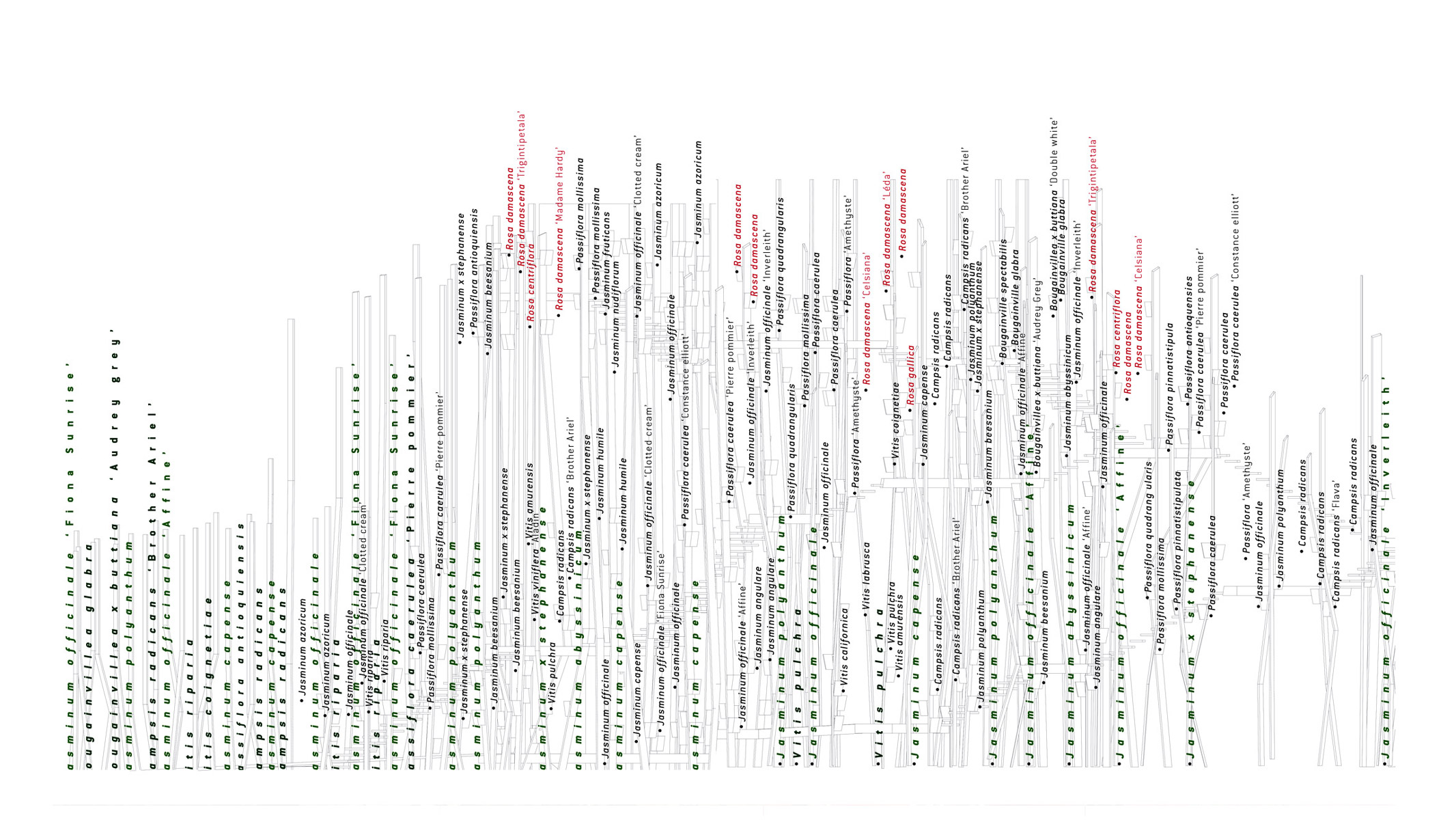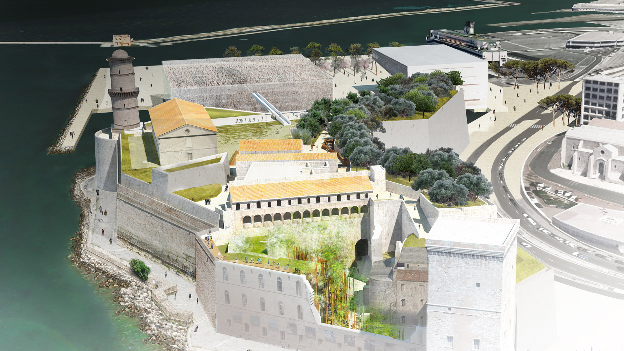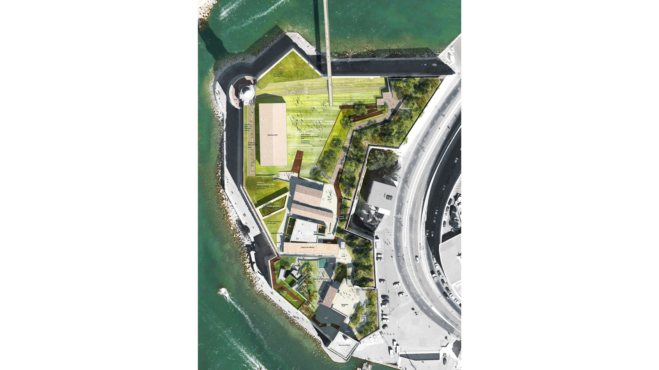 Ce jardin-galerie se déploie verticalement, sans toucher aux sols anciens de la cour, en un parcours narratif qui raconte l’histoire des plantes dans la civilisation méditerranéenne. Ce jardin fait le lien entre les deux niveaux du fort mais aussi entre le centre-ville et le port. Dans ce jeu d’élévations, la première perception du visiteur est une sensation d’étonnement lié à la verticalité et à l’originalité du jardin. Il se retrouve successivement enveloppé par des couleurs, des fragrances, et des plantes variées.
