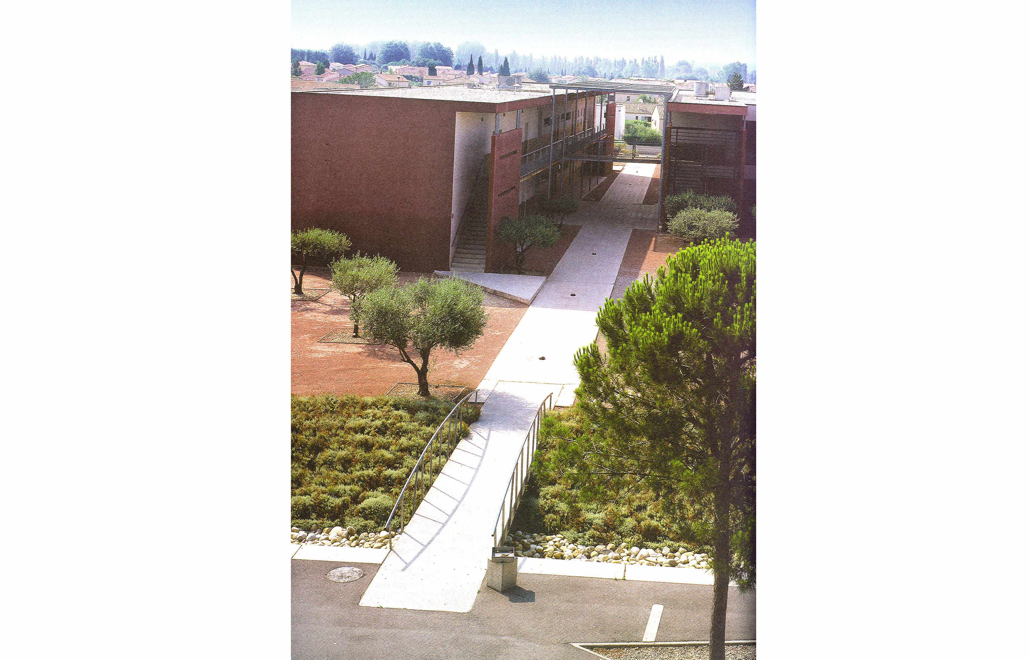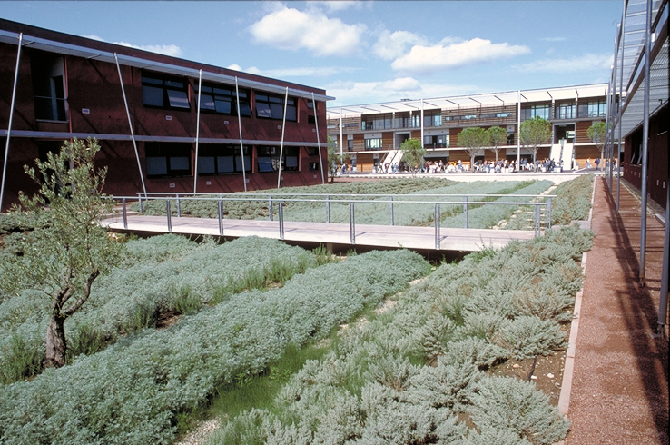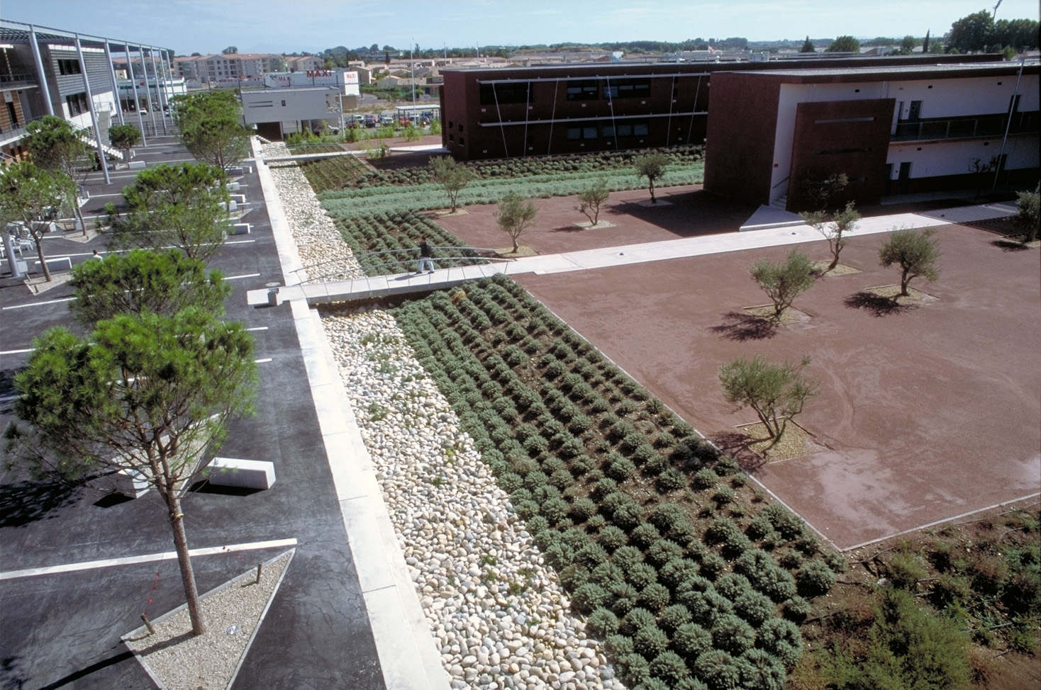 Dans un environnement suburbain manquant de cohésion, les architectes et l’Agence Ter ont opté pour une « architecture-jardin ». Derrière le long bâtiment de façade, s’étend une mer végétale d’espèces rustiques méditerranéennes qui forme le lien entre les six bâtiments enduits d’ocre rouge et de blanc. Avec le parking aménagé et planté de micocouliers qui, en dehors des périodes scolaires, devient un « espace à partager » pour le quartier, ce jardin contribue à faire du lycée Philippe-Lamour un élément d’urbanité dans cette zone mi-commerciale, mi-résidentielle.