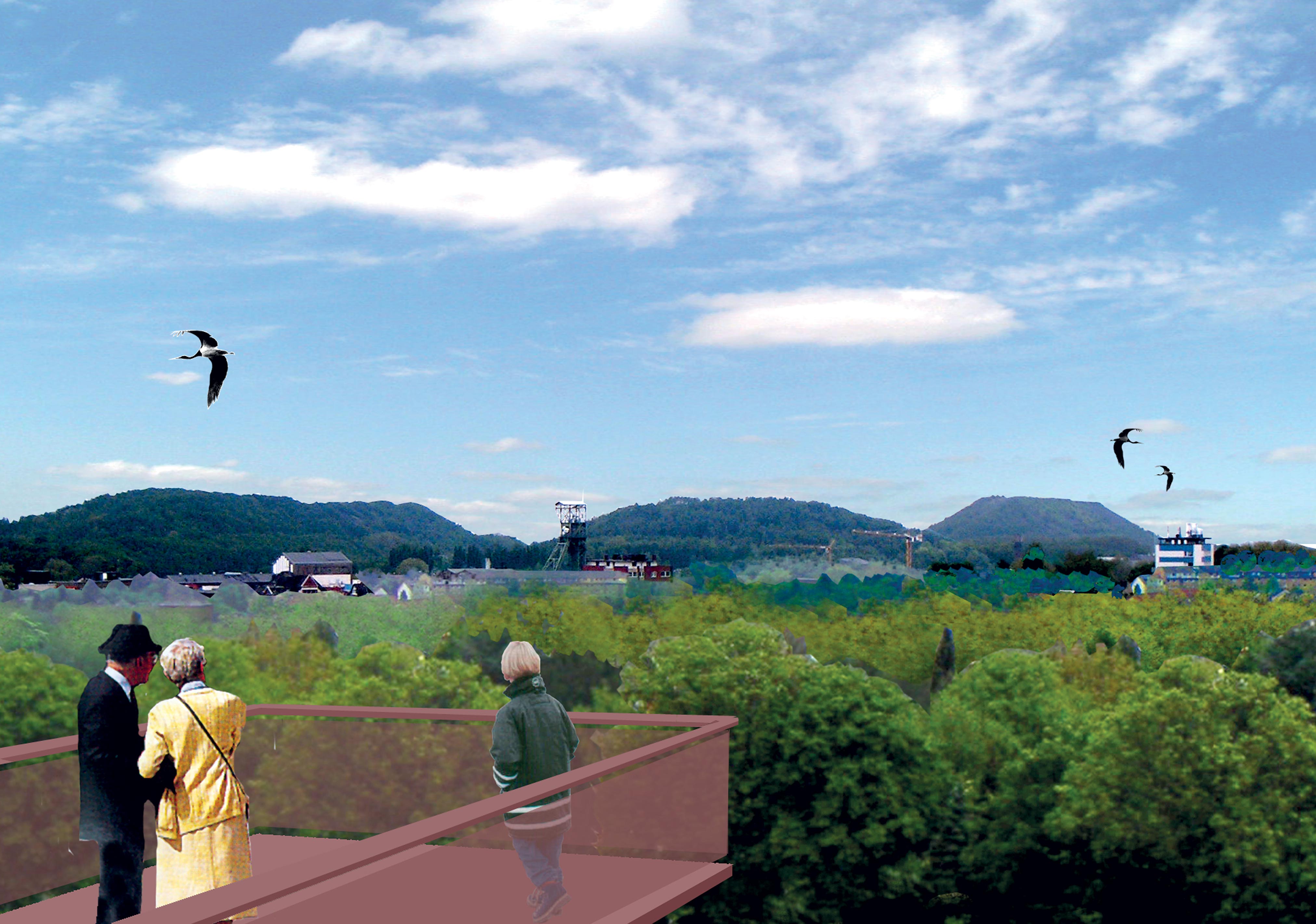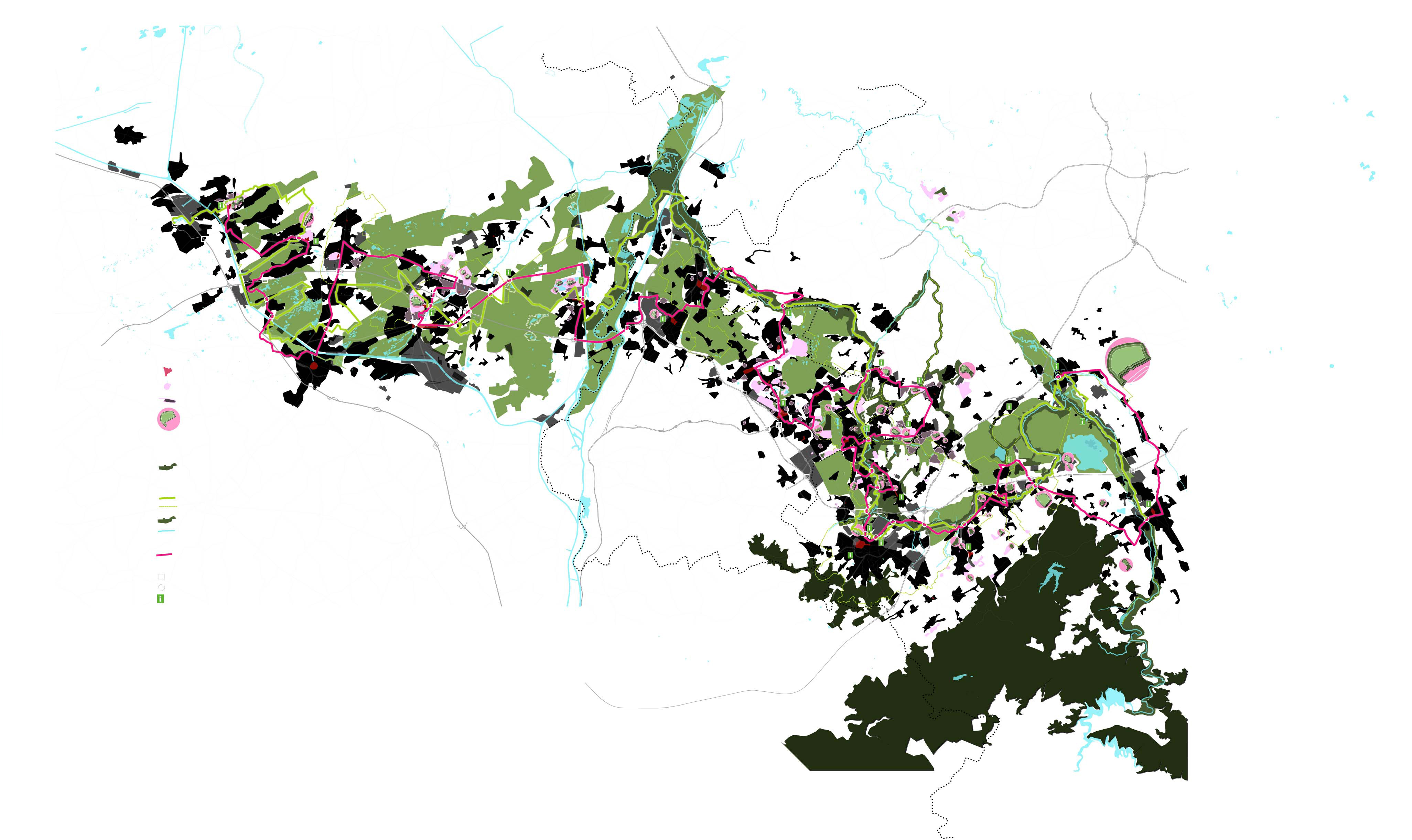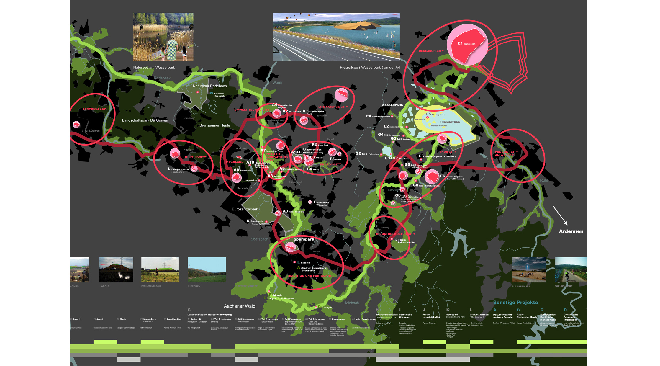 Afin de favoriser l’émergence d’une identité tri-nationale, l’Agence Ter choisit de mettre en communication les espaces fragmentés. En étudiant les strates escamotées du territoire elle découvre une couche de charbon souterraine qui parcours les trois pays et forme un champ partagé par leurs populations. Un écho à cette couche invisible est créé en surface et devient celle du projet « Métropole verte ». Le nouveau territoire est structuré par la route verte, qui connecte les parcs régionaux en longeant les cours d’eau et la route métropolitaine qui relie les centres urbains.