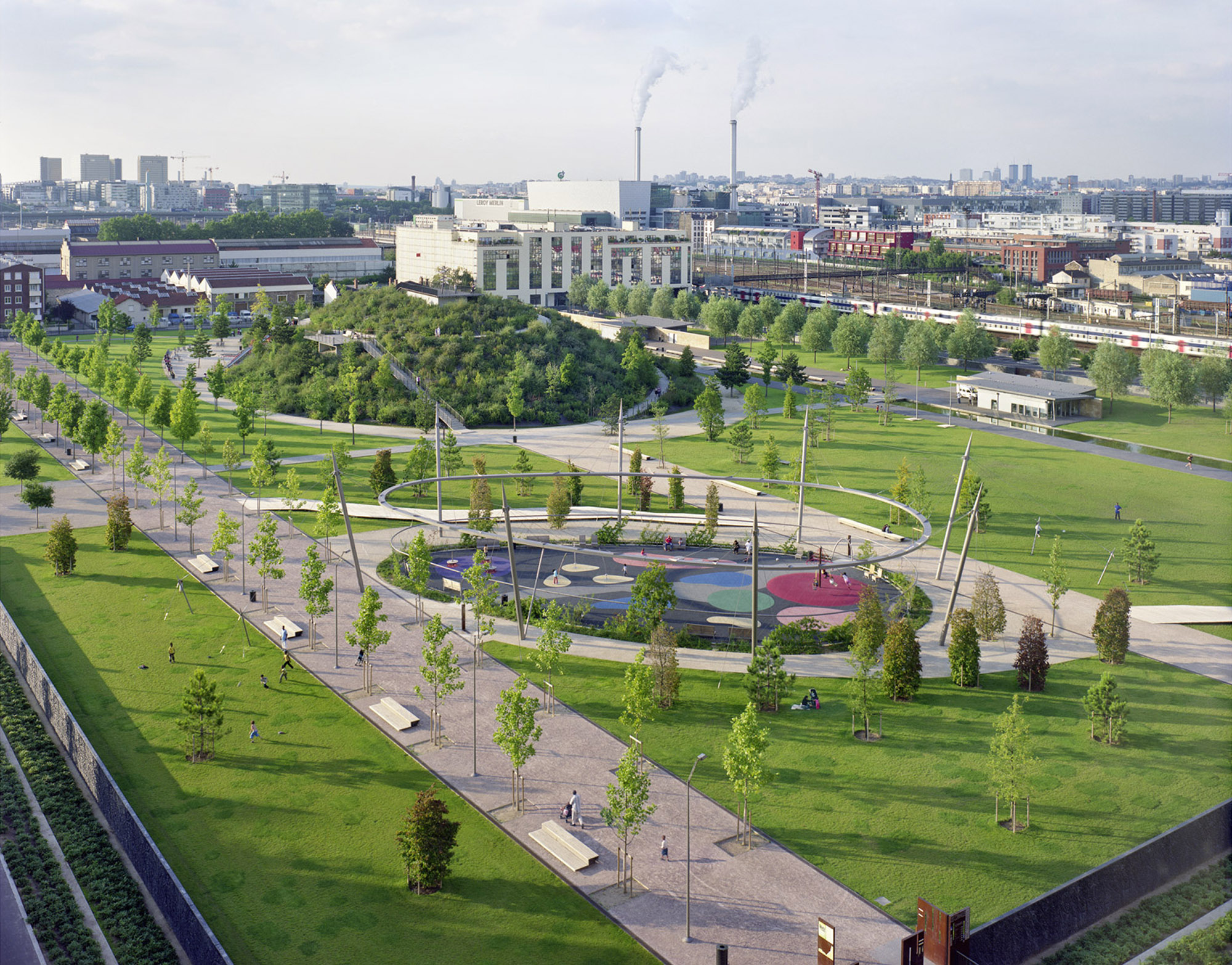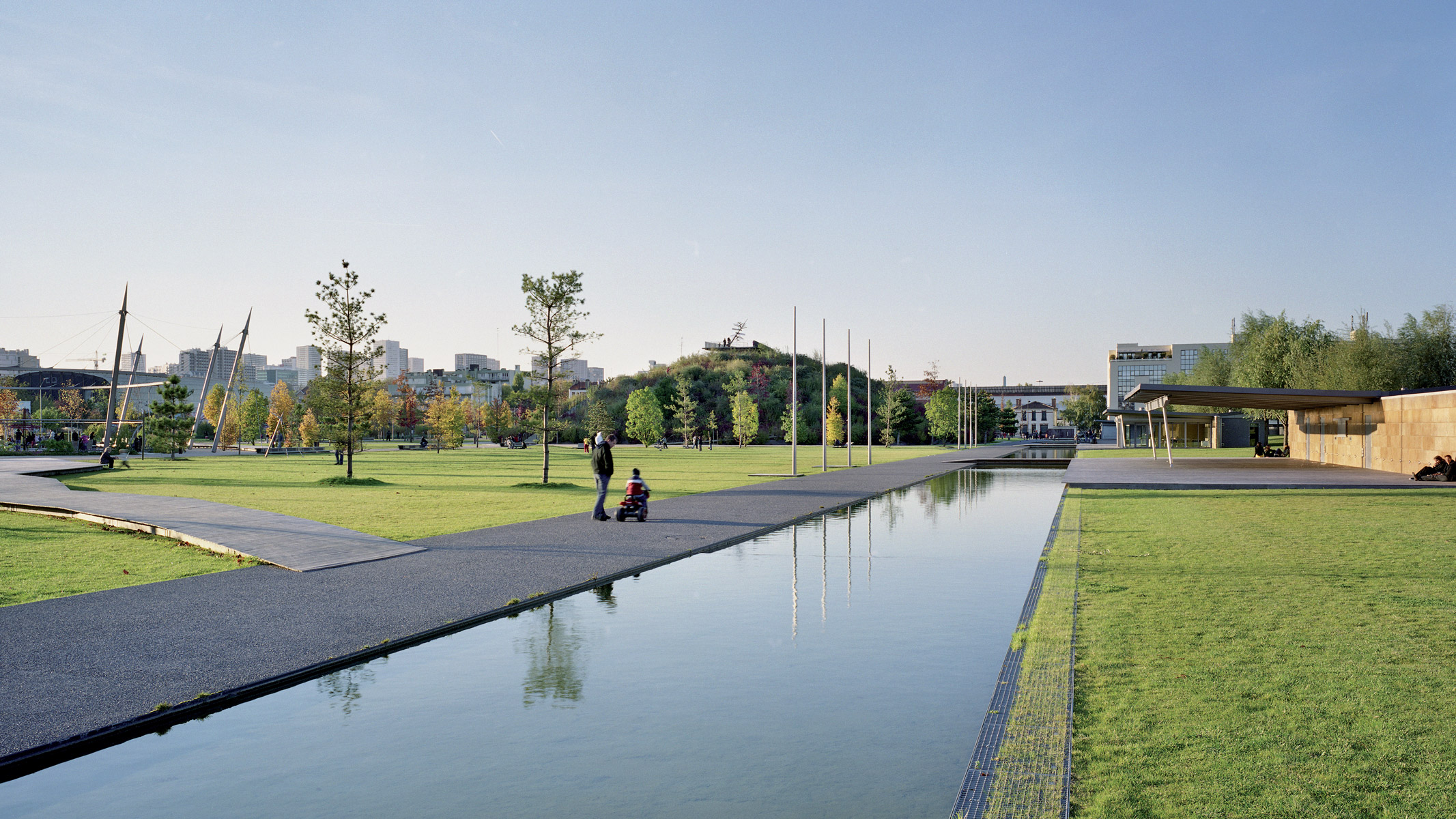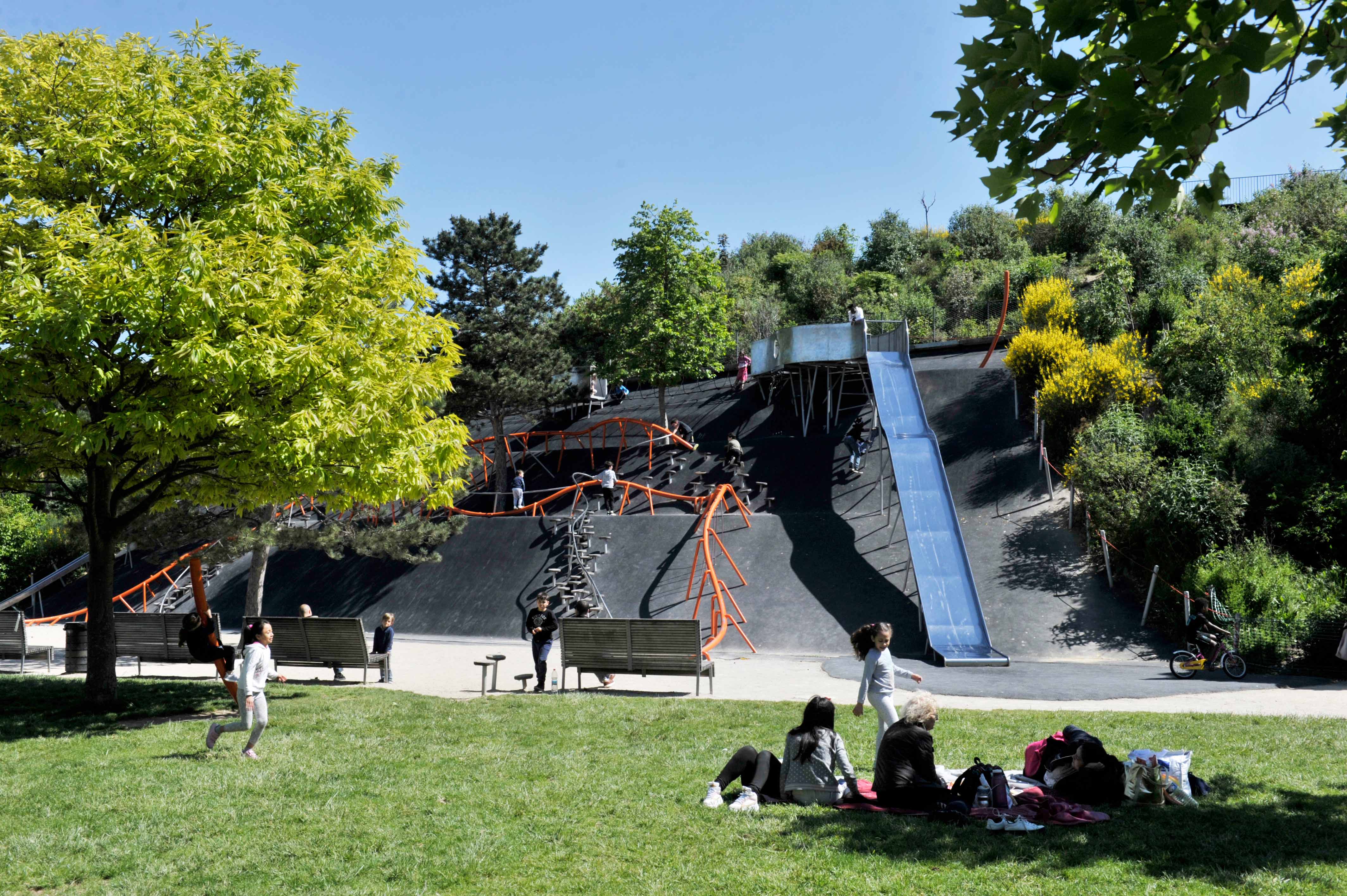 Ce parc perpétue l’horizontalité du paysage dessinée par les inondations de la Seine. Au nord, un belvédère permet d’observer le spectacle urbain alentour. Des jeux d’enfants sont posés dans une grande corbeille tandis qu’un jardin contemplatif se creuse dans le sol retrouvant la couche des limons des crues du fleuve et une végétation de type aquatique. Une grande pelouse au centre offre un espace apaisé et « une plage verte » bordée d’un long canal avec un système d’eau intégré servant de douches ou de brumisateurs pour le plaisir des enfants et la surprise des passants.