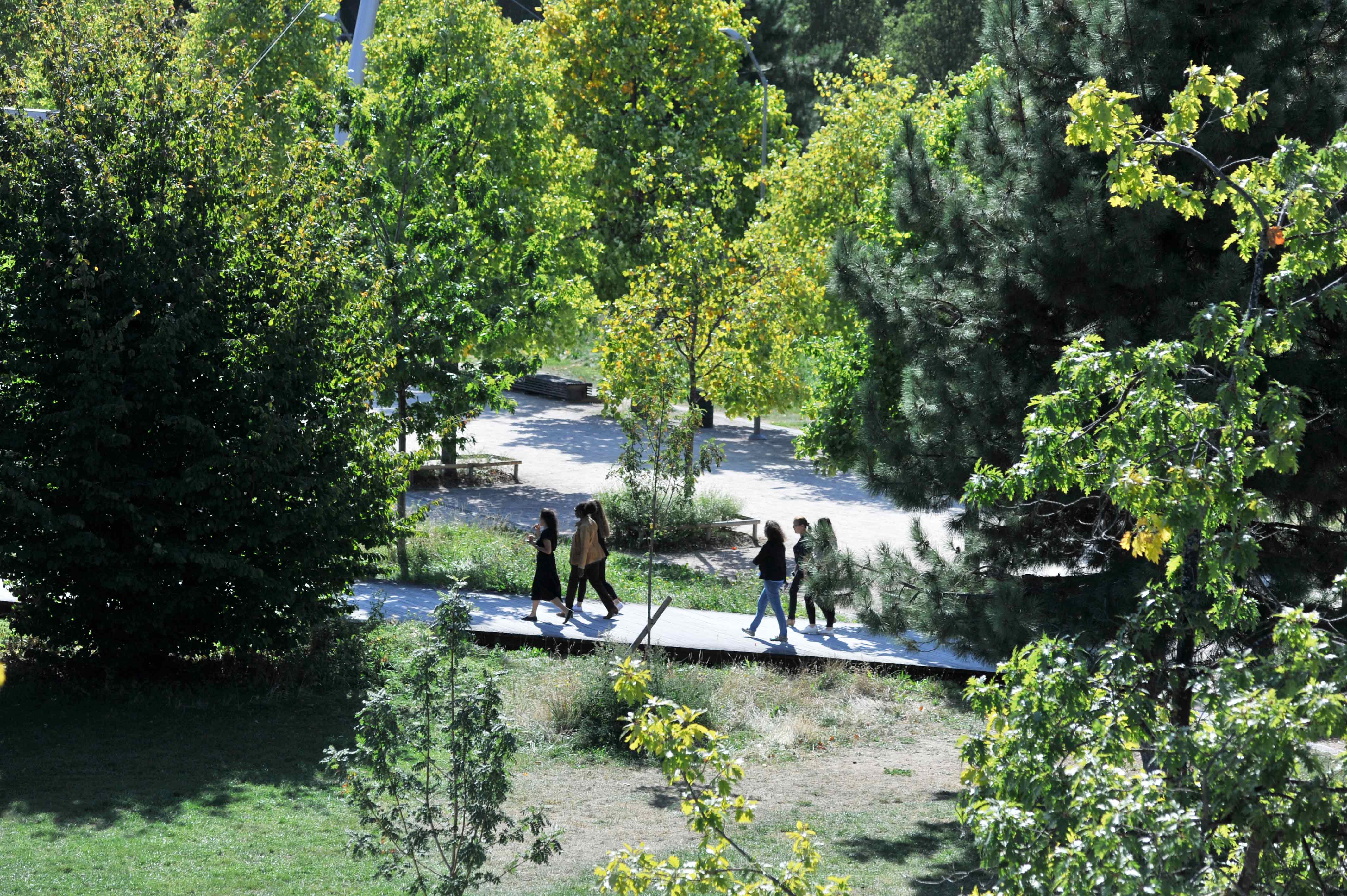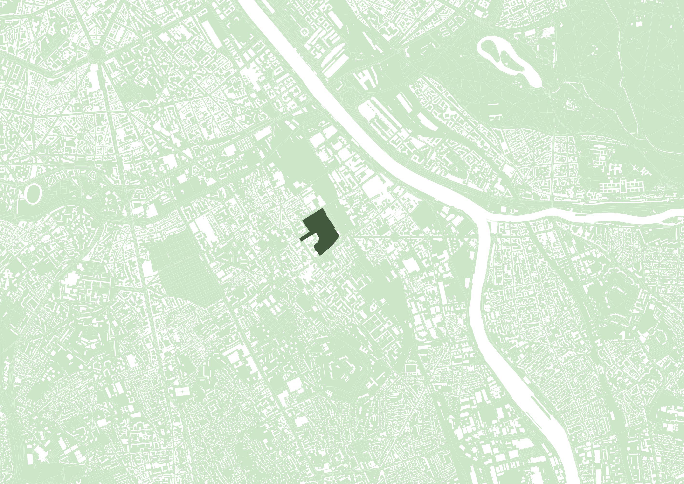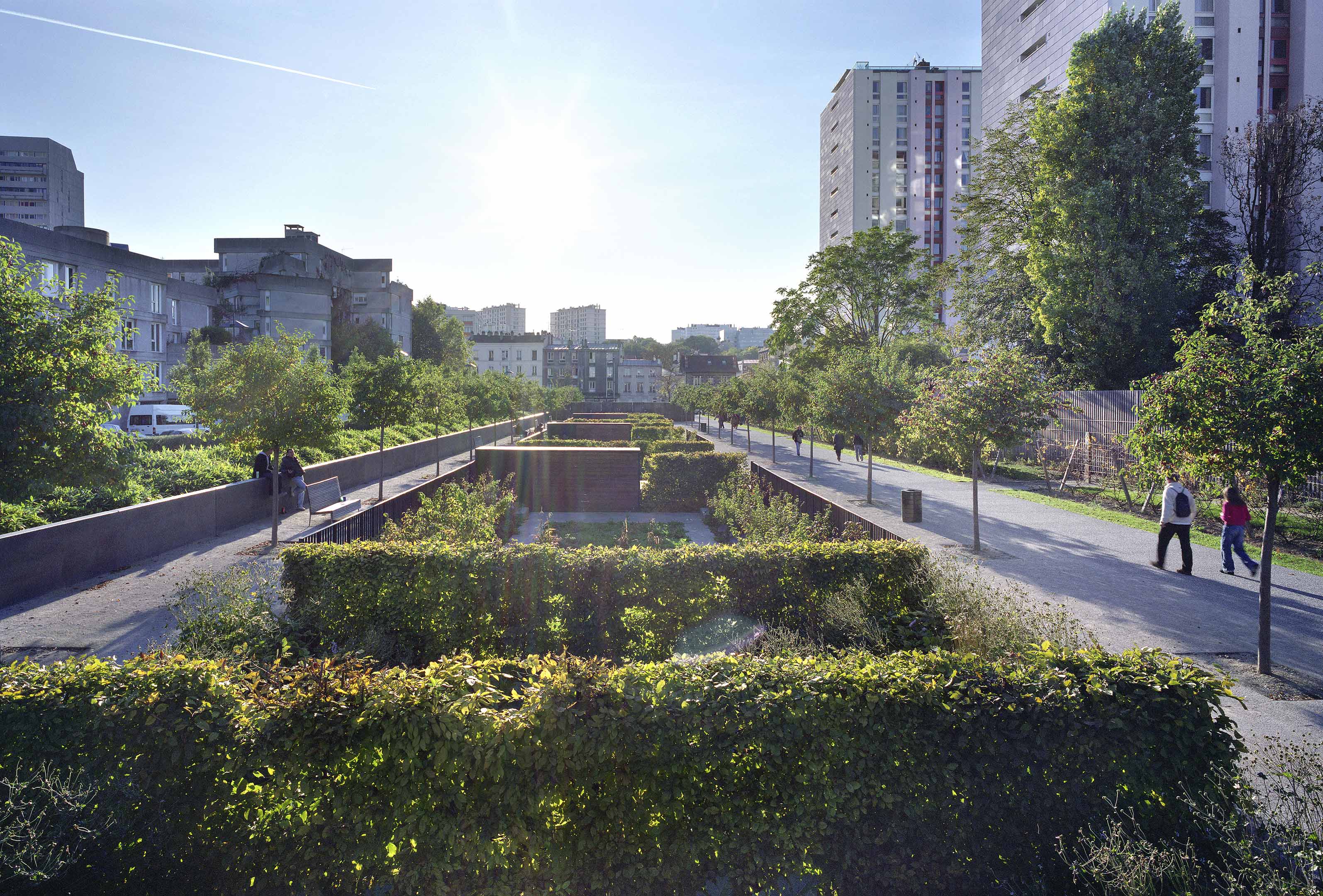 Ce parc perpétue l’horizontalité du paysage dessinée par les inondations de la Seine. Au nord, un belvédère permet d’observer le spectacle urbain alentour. Des jeux d’enfants sont posés dans une grande corbeille tandis qu’un jardin contemplatif se creuse dans le sol retrouvant la couche des limons des crues du fleuve et une végétation de type aquatique. Une grande pelouse au centre offre un espace apaisé et « une plage verte » bordée d’un long canal avec un système d’eau intégré servant de douches ou de brumisateurs pour le plaisir des enfants et la surprise des passants.
