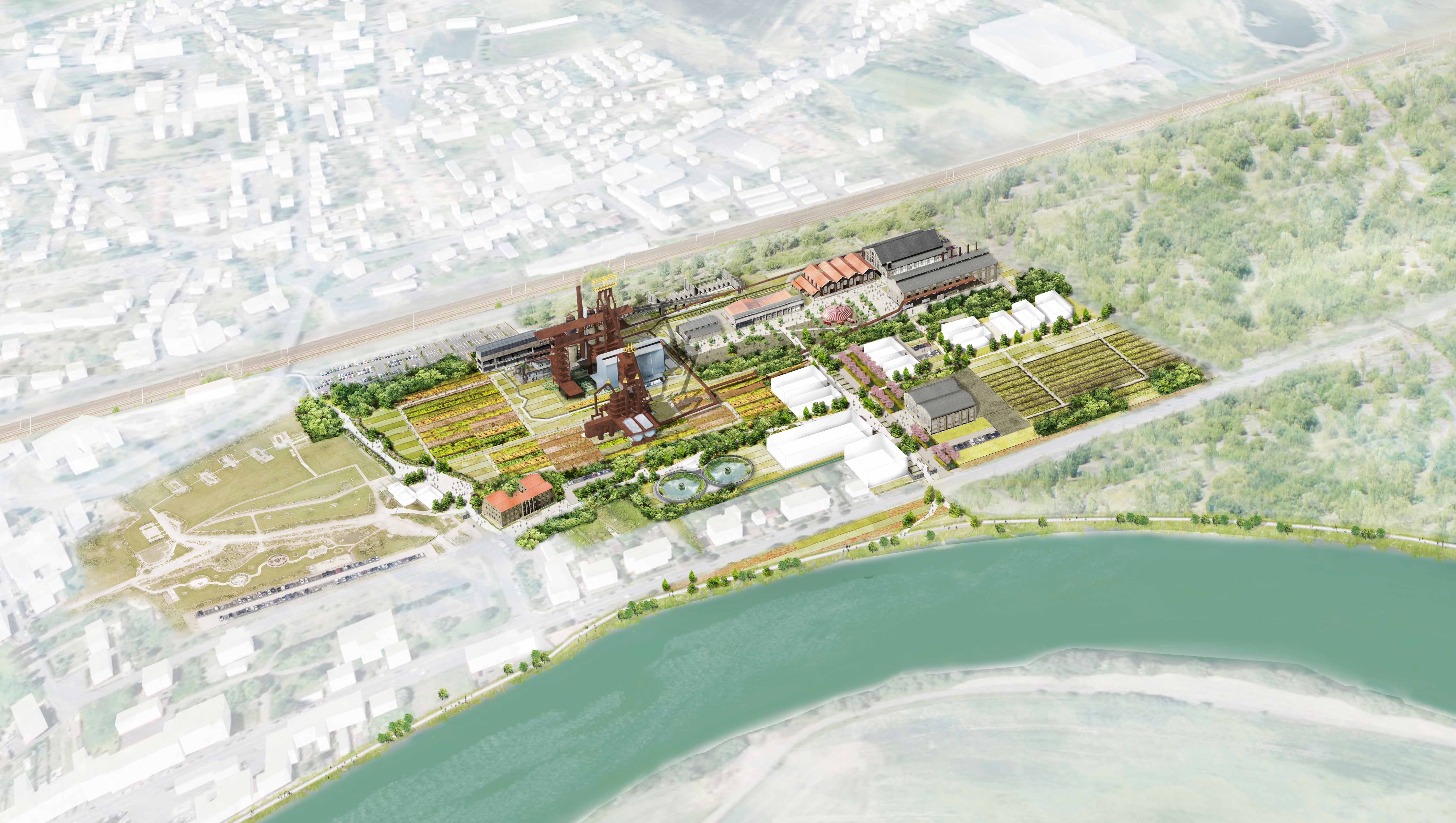Depuis l’arrêt de l’activité industrielle au début des années 90, le haut fourneau domine une vaste friche industrielle parsemée de bâtiments annexes. Dans ce contexte, la mission de conception du parc consiste ainsi à proposer un plan guide des espaces accessibles au public. Matérialisé par la mise en place de plus de 500 jalons ces parcelles sont traversées par un cheminement central appelé “Traverse”. La Traverse permet de traverser le site en scénographiant le caractère industriel et évolutif d’un site dont les usages et occupation ne sont à l’heure actuelle que pressentis.