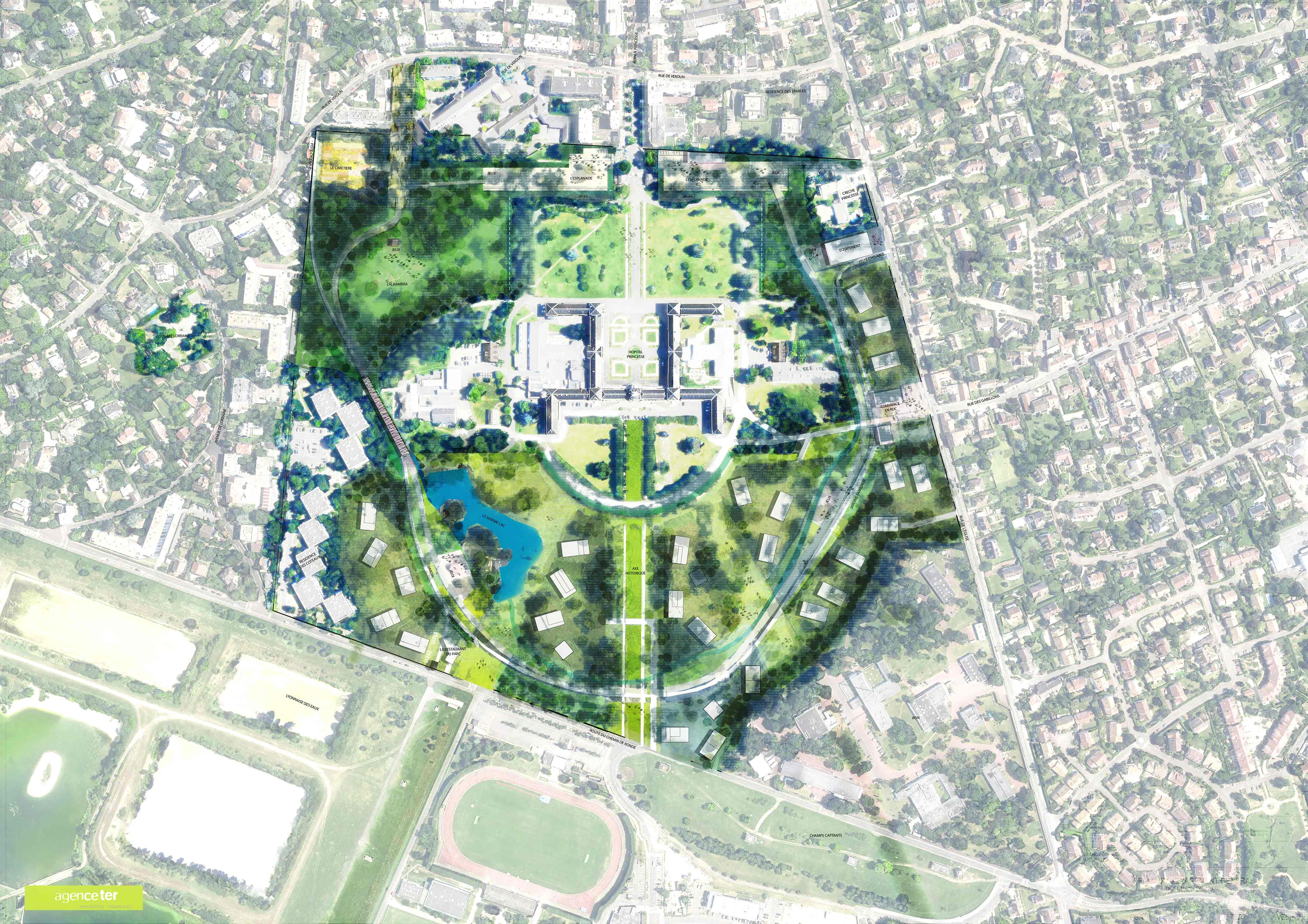 L’écoquartier du Parc princesse constitue une opportunité foncière pour la Ville pour créer un nouveau quartier de logements et d’équipements. Sur ce site presque entièrement boisé, l’Hôpital du Vésinet constitue une figure centrale du futur quartier. Le projet propose d’instaurer une greffe urbaine dans le respect des éléments fondateurs de la ville et de maintenir au maximum les arbres remarquables en valorisant les boisements. Pour cela les constructions sont prioritairement implantées dans les clairières aux sols peu fertiles ou à l’emplacement d’anciennes constructions.