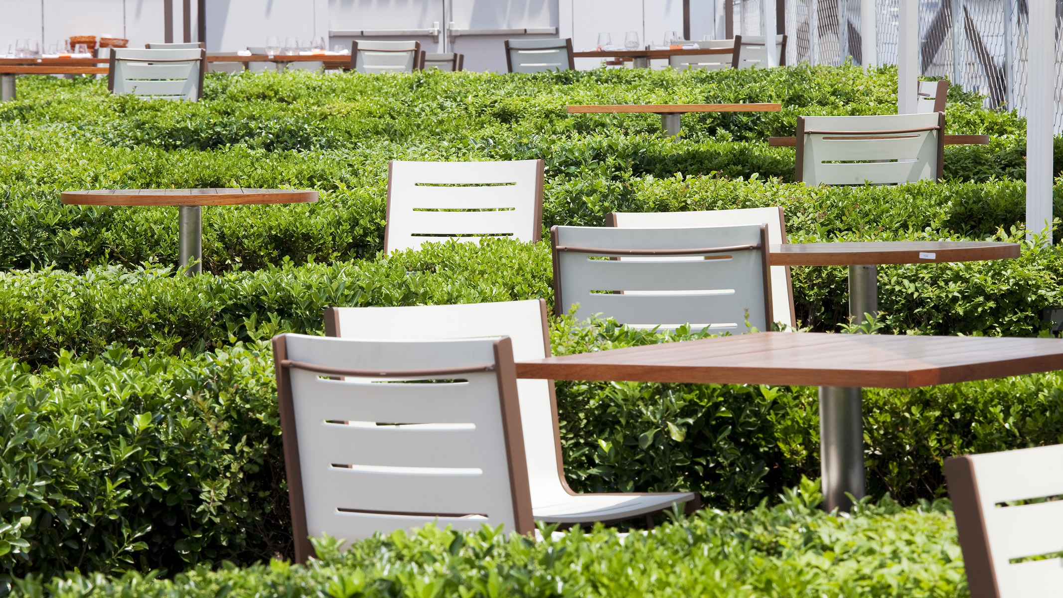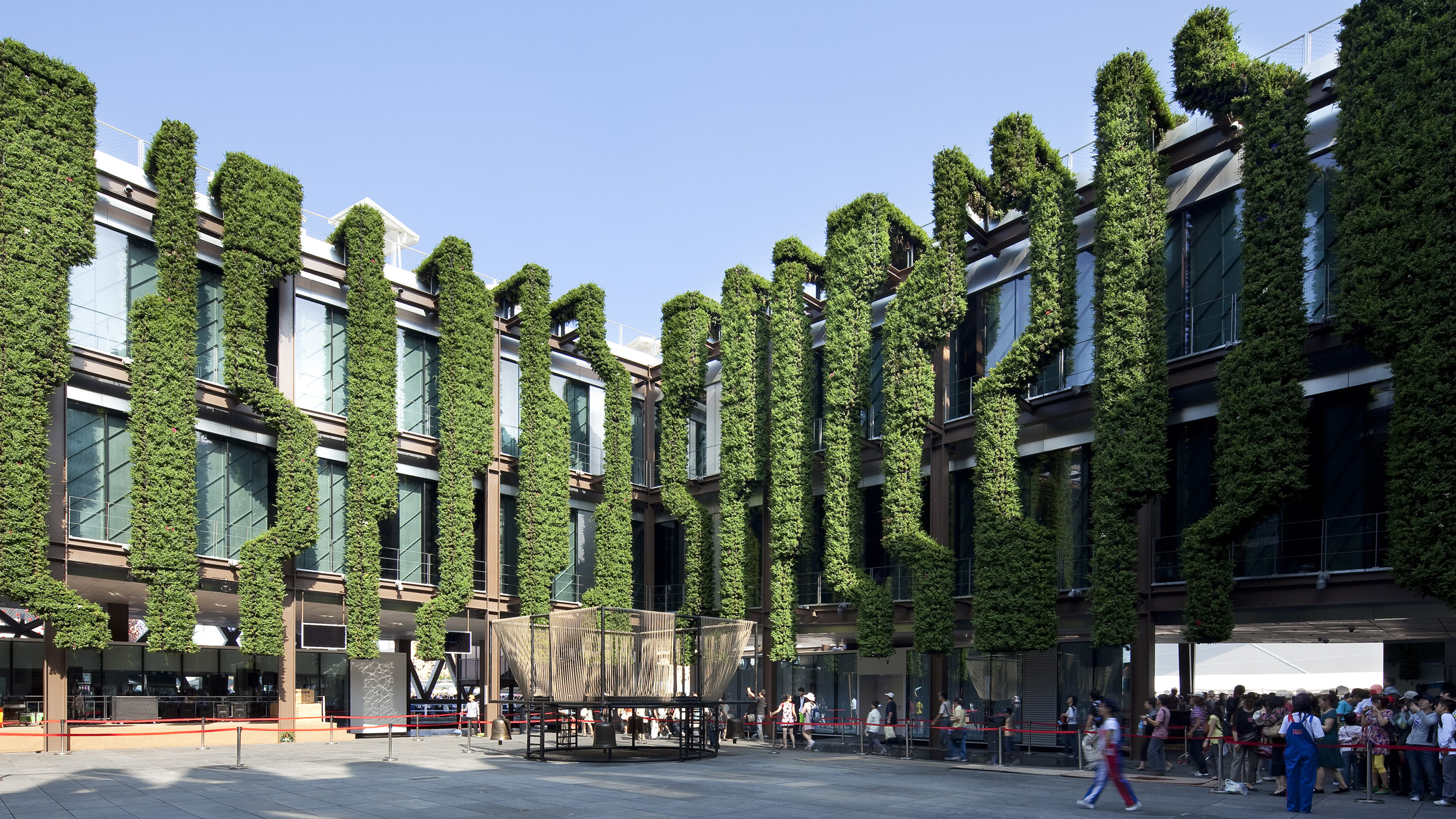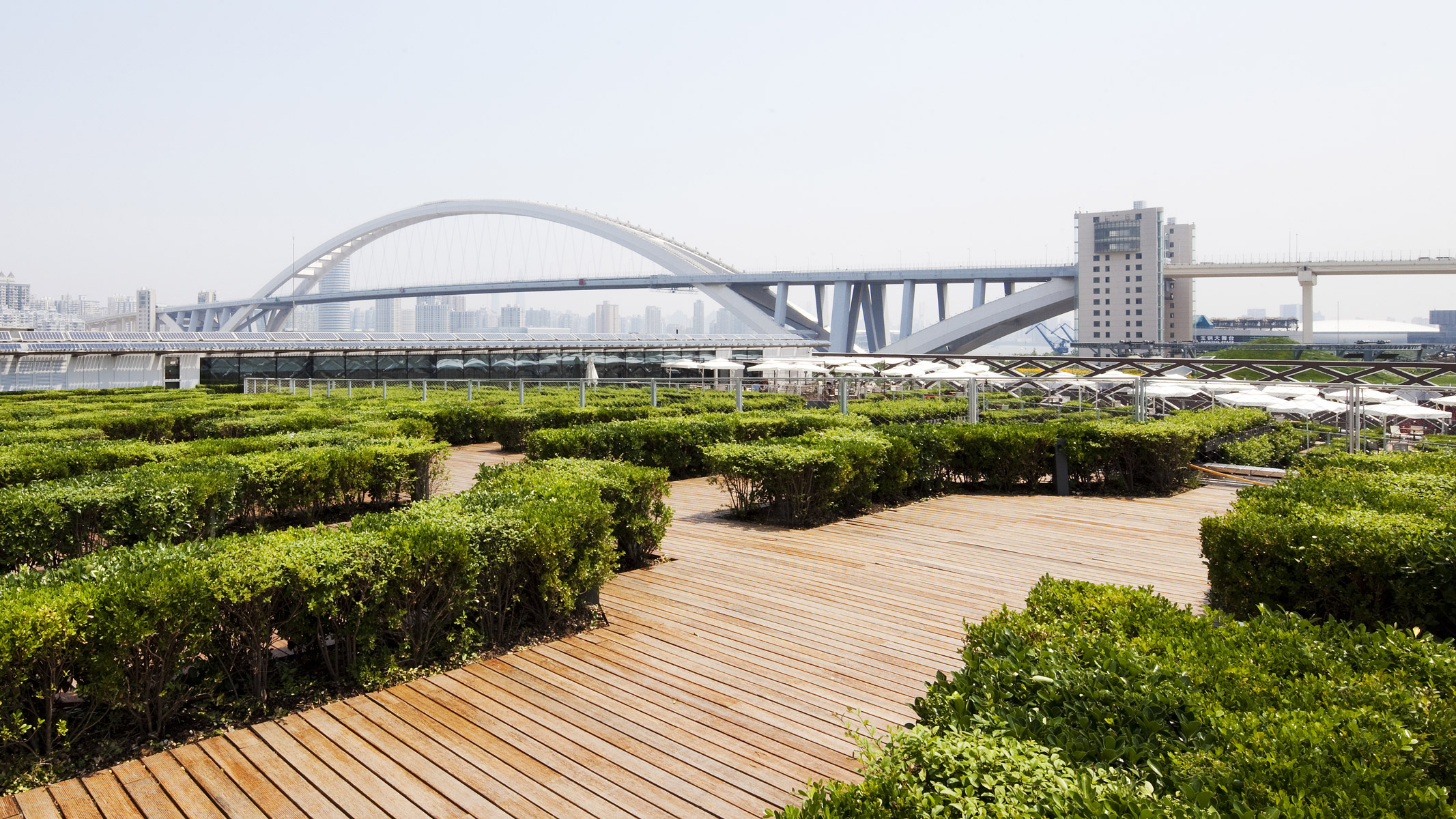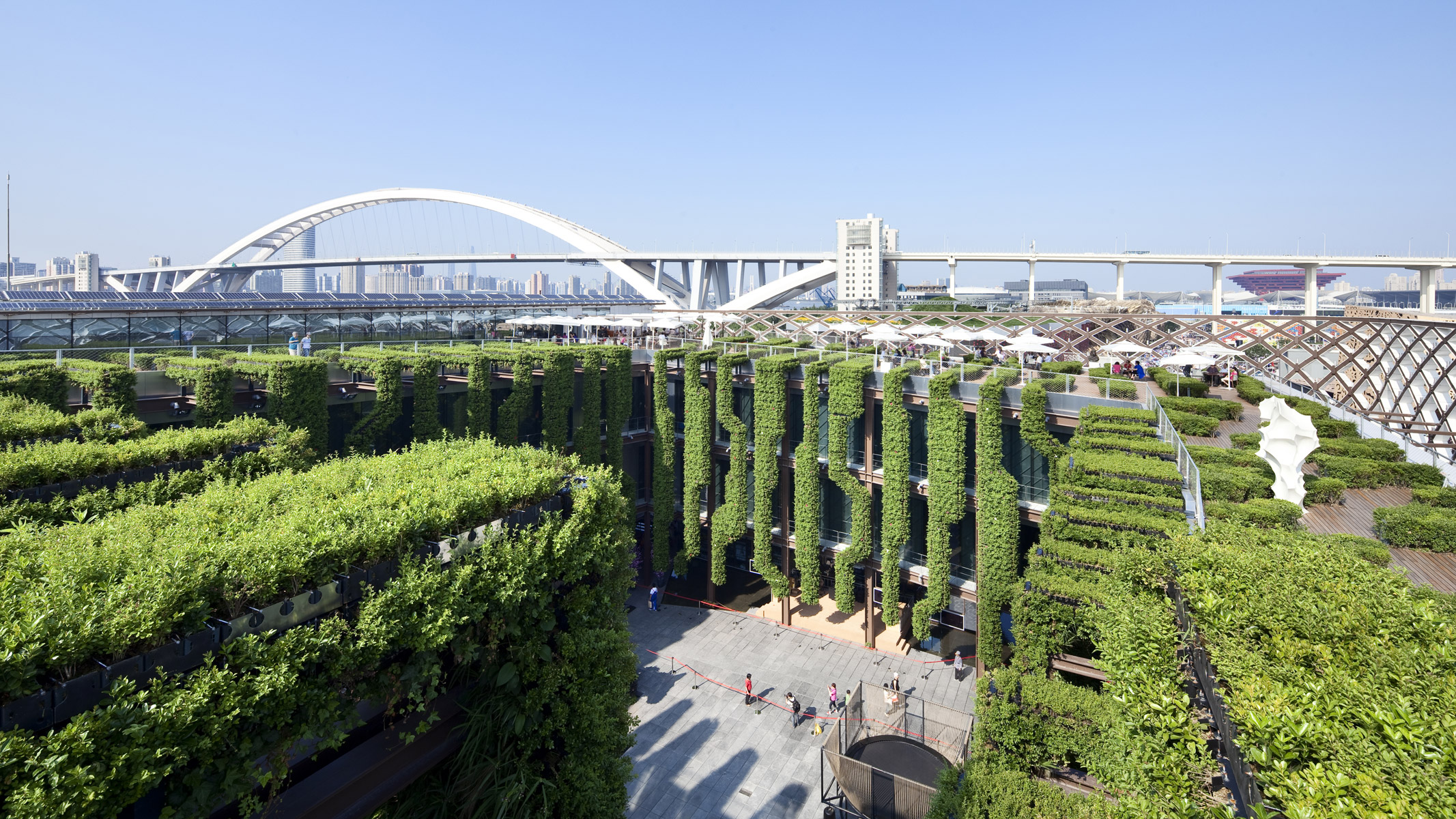 En réponse au thème de l’Expo 2010, le pavillon de la France constitue une preuve de sa capacité à être force de propositions dans les domaines, culturels, artistiques ; de l’innovation et du développement durable. Le jardin du pavillon de la France constitue une redéfinition contemporaine des parterres de broderies du jardin à la française. Ce parterre vient animer la terrasse panoramique puis redescend vers le patio central et se transforme en un jardin vertical d’une quarantaine d’espèces végétales. Le centre du patio est occupé par une lame d’eau animée de jets.