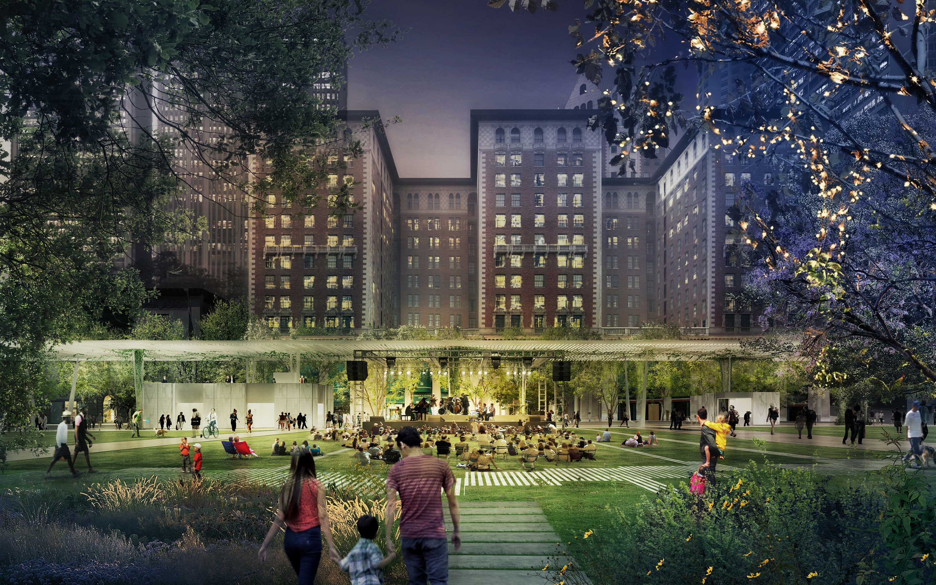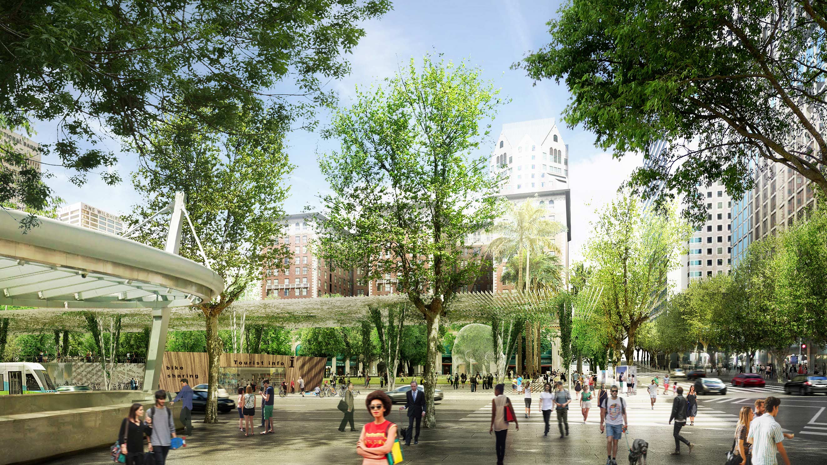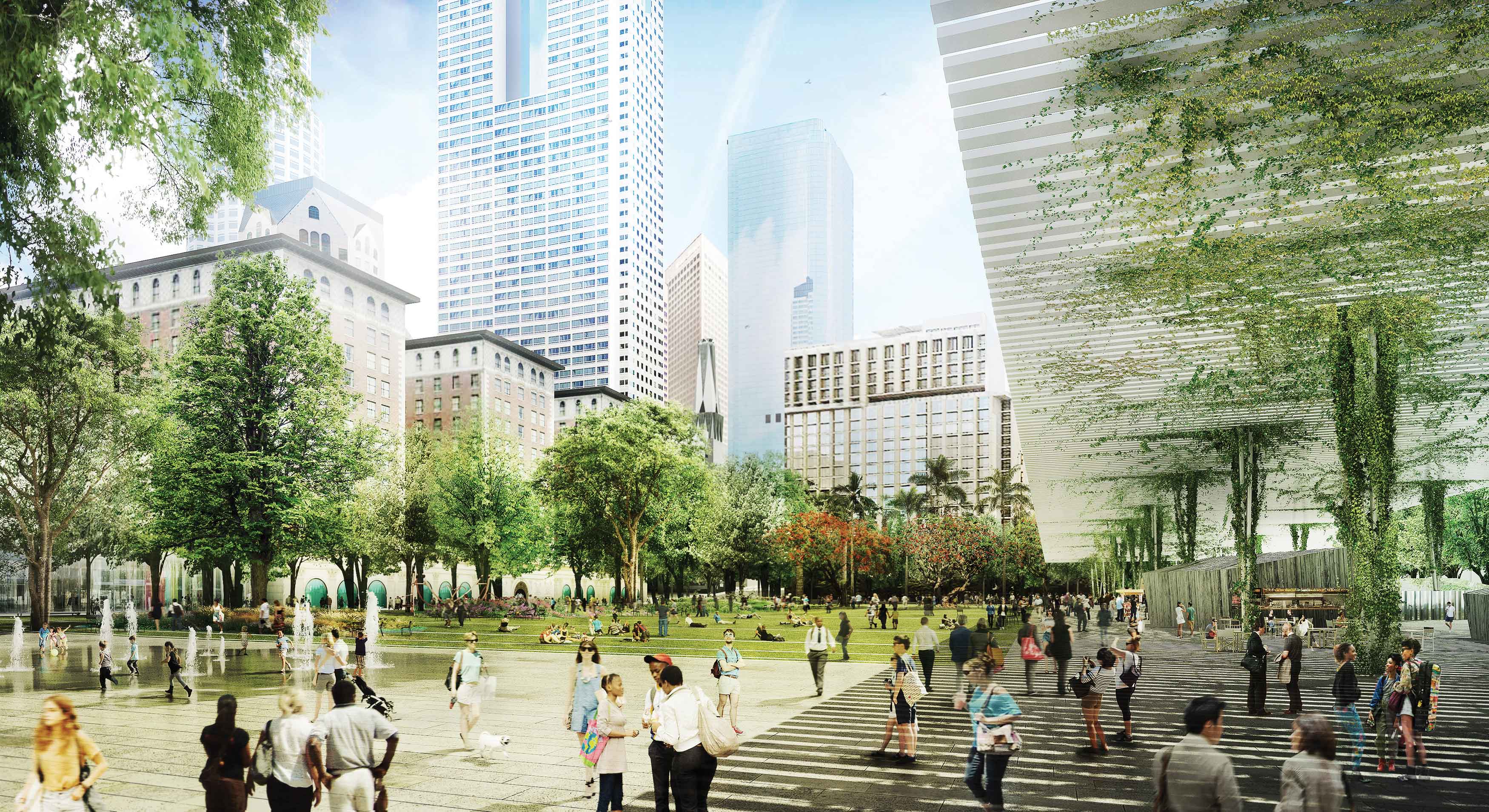 Pershing Square est un des espaces publics historiques de Downtown Los Angeles. Le parc a perdu sa fonction initiale de poumon vert et de lieu de rencontre par la création d’un parking souterrain a surélevé, isolant cet espace du contexte urbain. Le projet remet la place au niveau de la rue le rendant inclusive, démocratique et accessible à partir de toutes les directions et pour tout le monde, sans escaliers ni murs. La place proposera des jardins sous le couvert d’arbres indigènes et une « smart canopy ». Au centre une grande pelouse ouverte peut recevoir des activités de toute échelle.