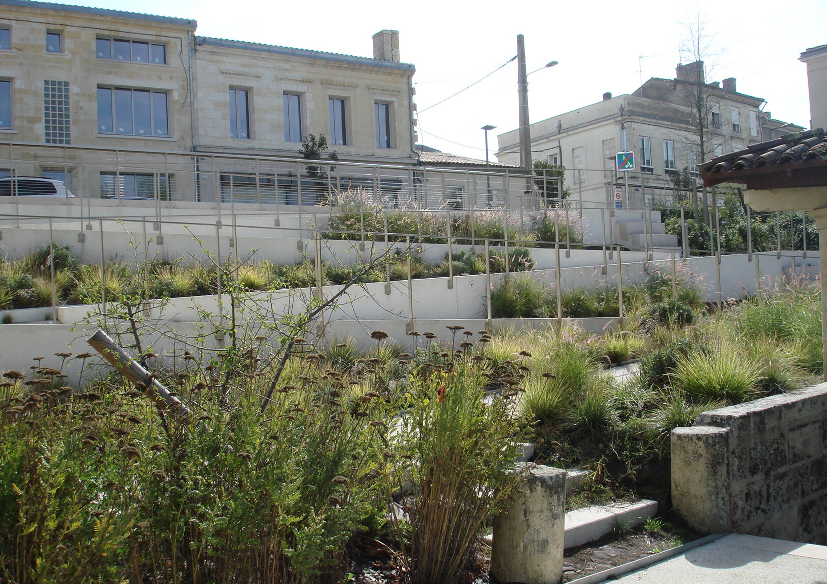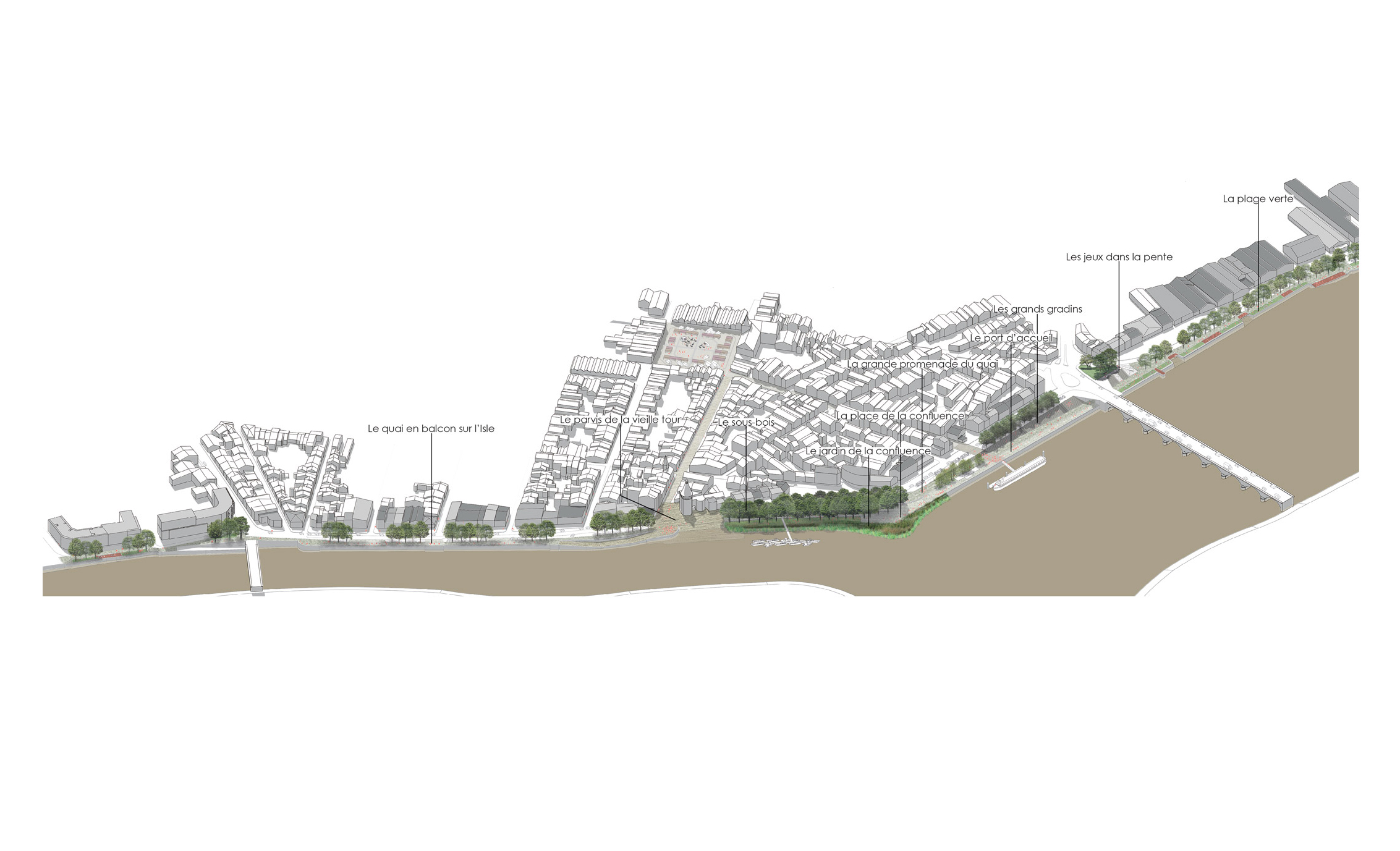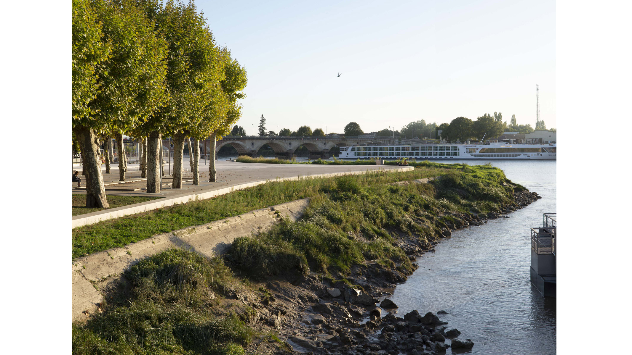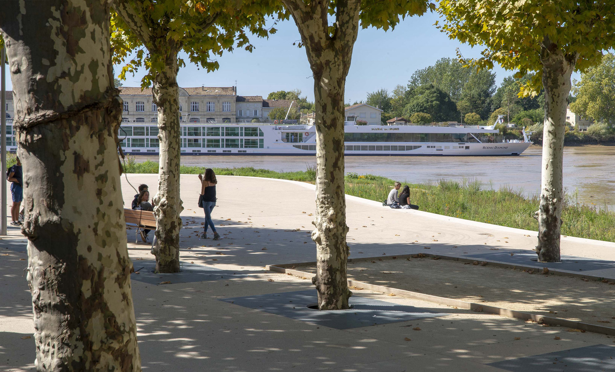 Les quais de Libourne, historiquement conçus pour le commerce du vin, étaient devenus un espace de stationnement. Le projet propose à la fois une nouvelle urbanité sur les berges et une nouvelle nature liée à l’eau permettant la coexistence entre inondabilité et usages. Le projet développe les mobilités douces avec une grande promenade qui relie le fleuve à la ville ainsi qu’un long trottoir planté qui invite les promeneurs à marcher jusqu’au pont de Fronsac. Le projet respecte le cycle naturel de l’eau par un travail de micro-topographie et la mise en place d’une végétation diversifiée.
