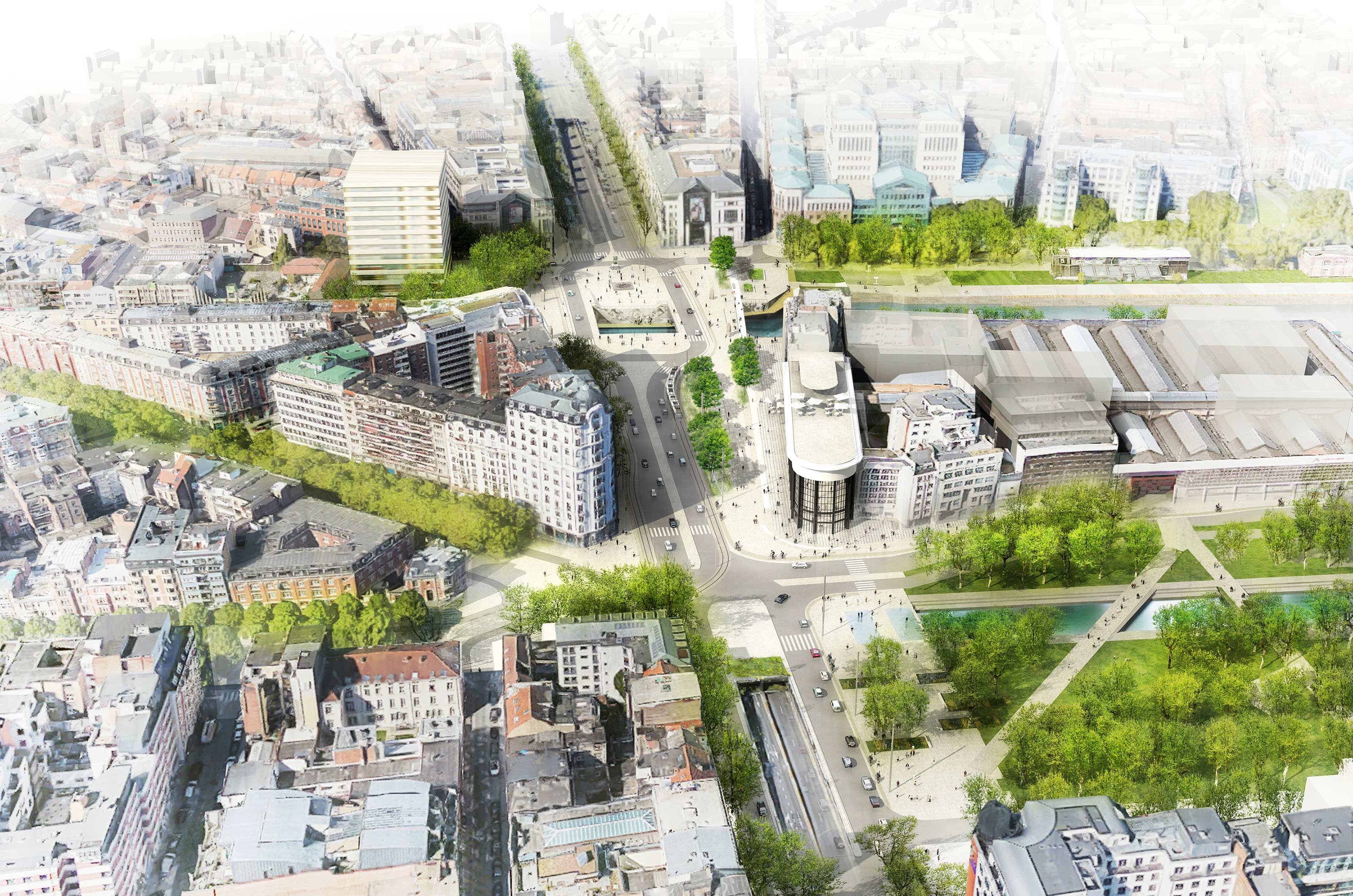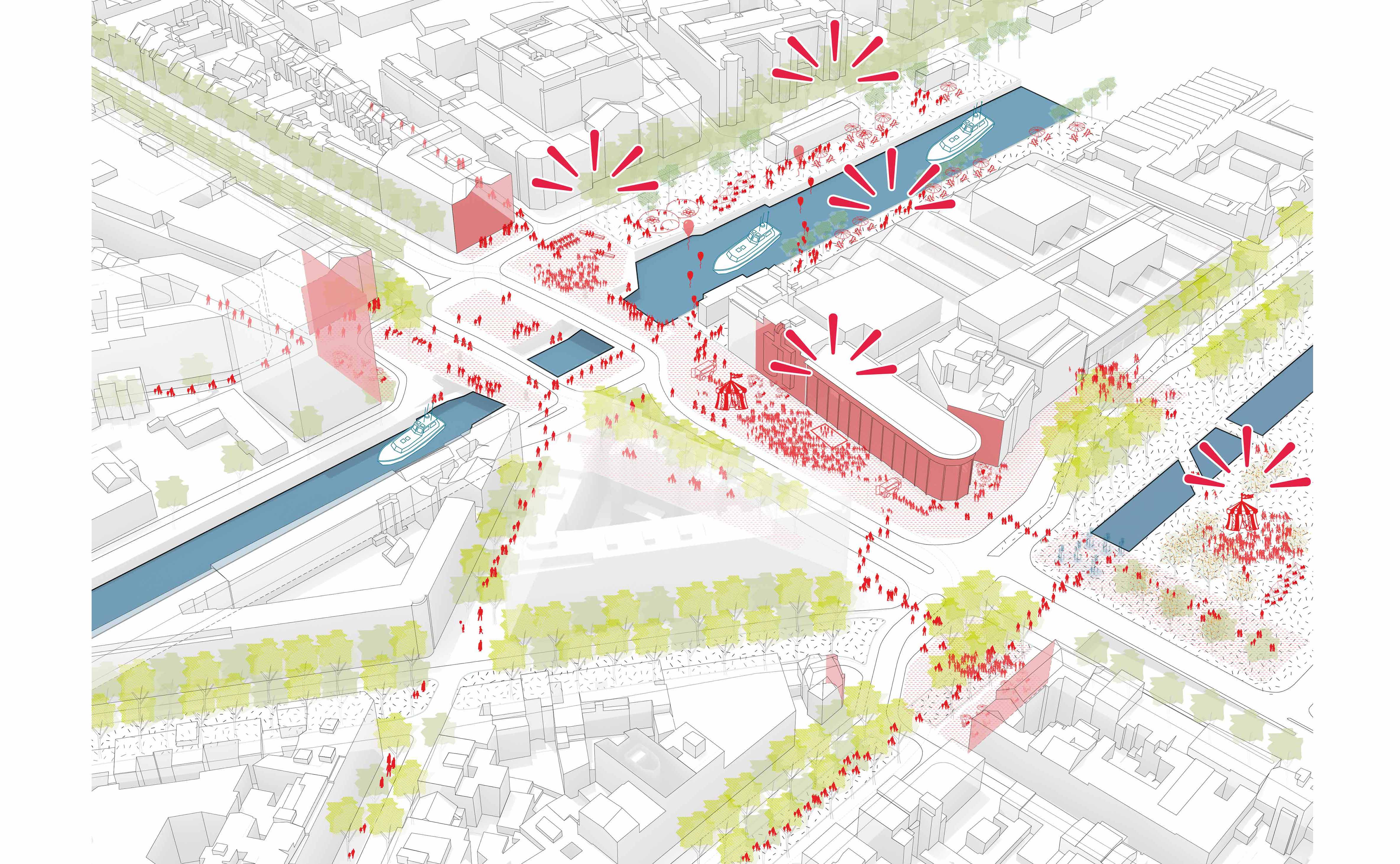 Caractérisé par la rencontre entre des espaces publics très diversifiés, Sainctelette devient un point de convergence dans la ville. Le projet propose une place-pont qui repositionne le canal comme un lien entre l’ouest et l’est de la ville. Deux grandes promenades associant paysage, composition urbaine et mobilités douces accompagnent les déplacements. En élargissant les côtés extérieurs des ponts actuels par l’ajout de deux passerelles piétonnes, l’infrastructure se transforme en place. Ainsi le canal et Sainctelette se repositionnent au centre de l’espace.