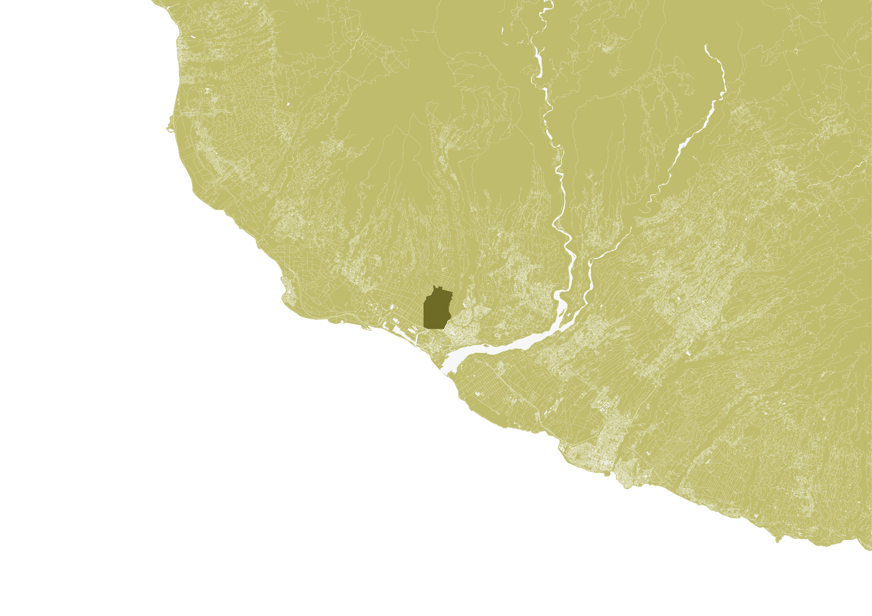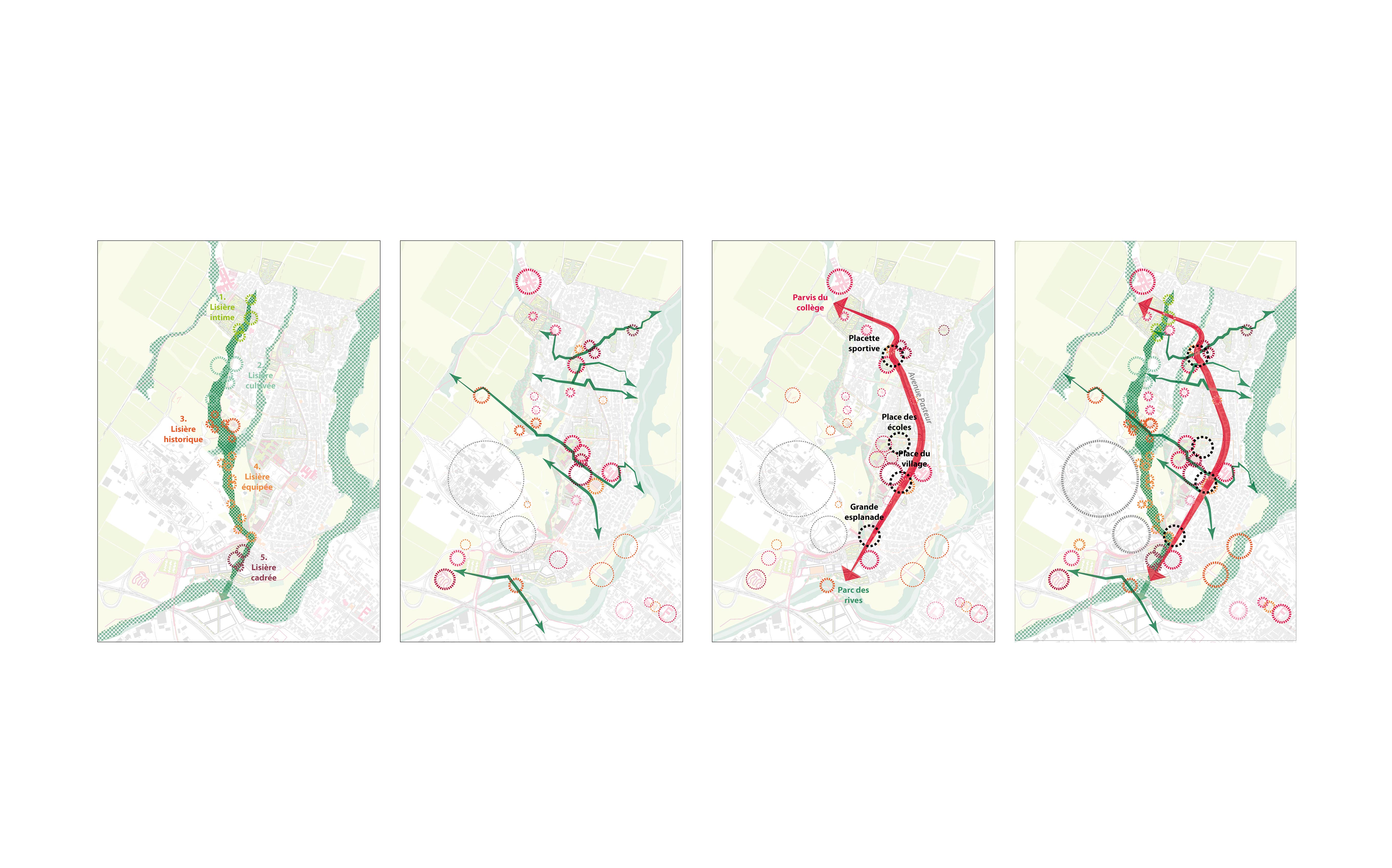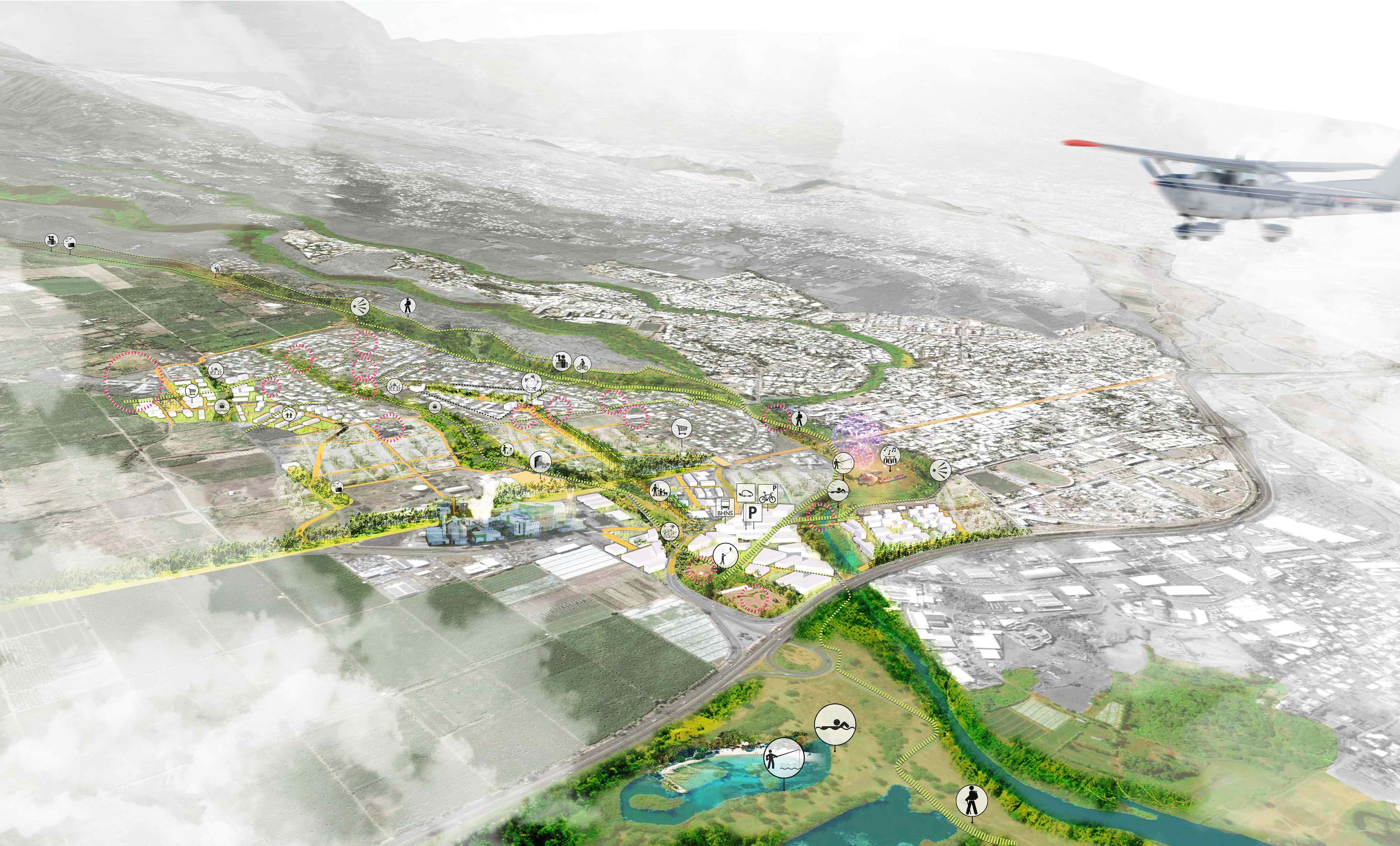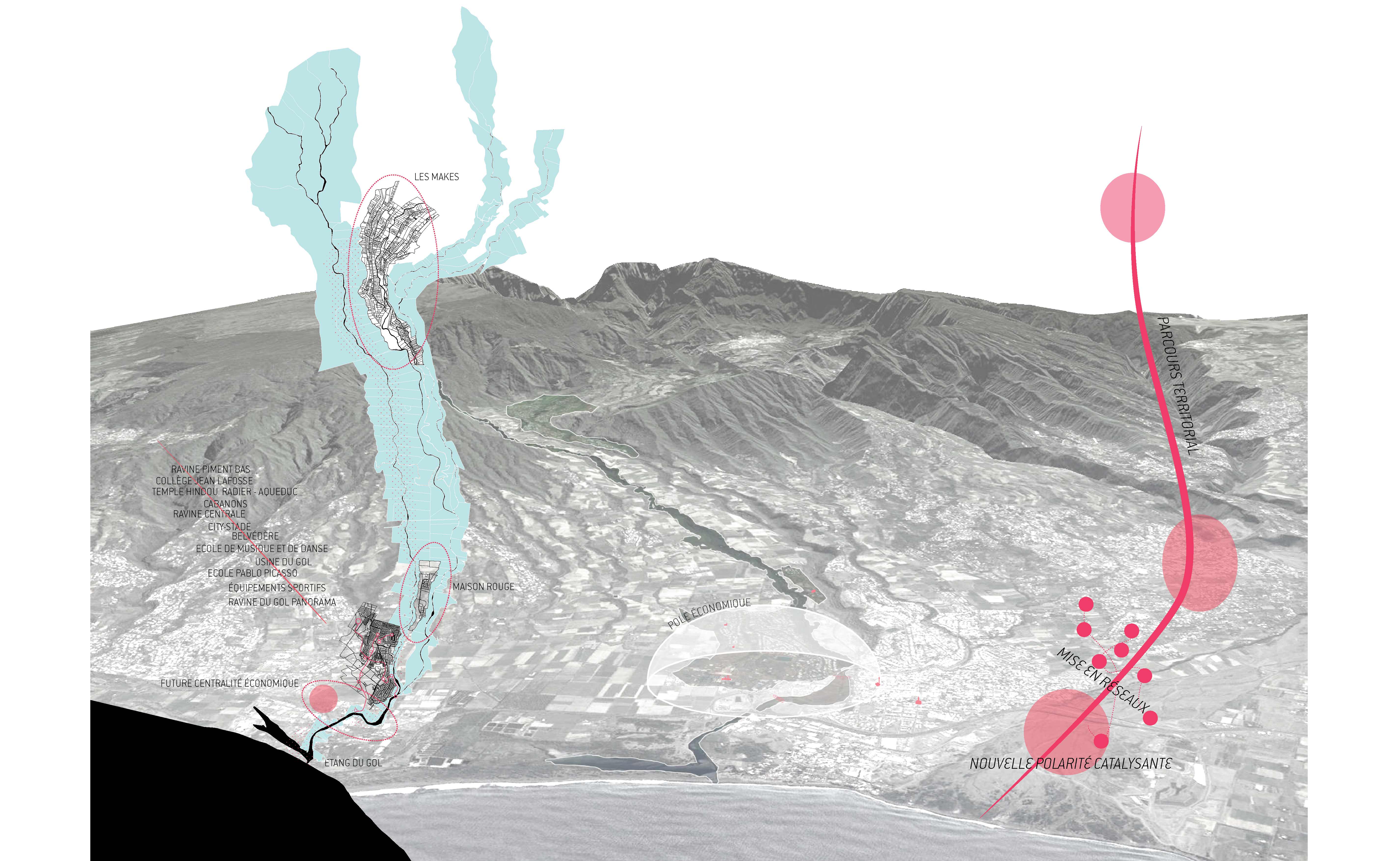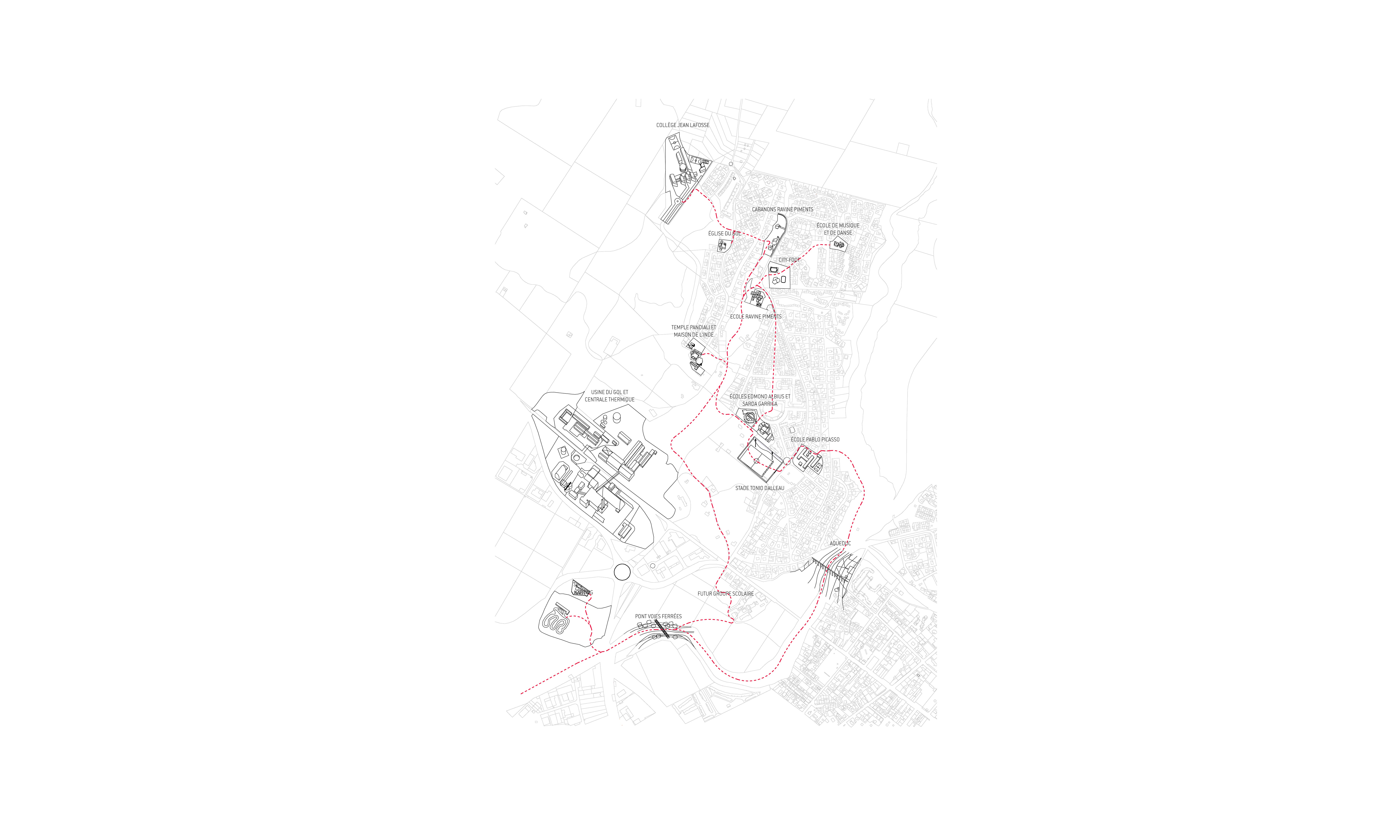 Le périmètre s’étend de la ravine du Gol à la ravine Papaye jusqu’aux champs de canne au Nord et à la RN1. Trois éléments de territoire majeurs permettent la construction du futur projet : les ravines, marqueurs du paysage, la topographie, nouveau support du dessin du projet et les polarités qu’elles soient culturelles, scolaires, sportives, commerciales ou historiques. L’avenue Pasteur reprend sa place de colonne vertébrale du quartier tandis que La grande lisière, joue habilement entre mise à distance et mise en valeur de l’Usine.